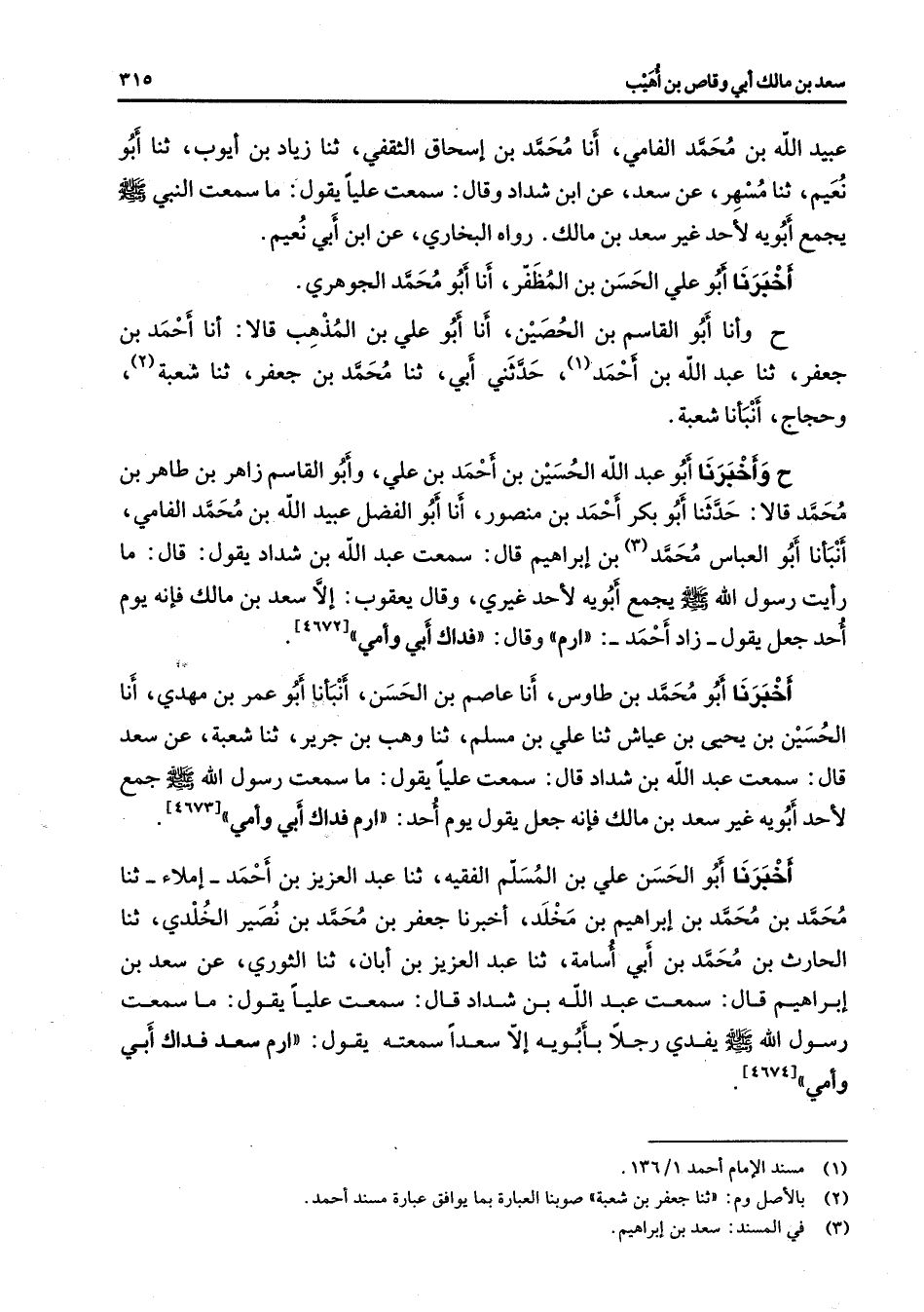 عبيد الله بن محمد الفامي أنا محمد بن إسحاق الثقفي ثنا زياد بن أيوب ثنا أبو نعيم ثنا مسهر عن سعد عن ابن شداد وقال سمعت عليا يقول ما سمعت النبي (صلى الله عليه وسلم) يجمع أبويه لأحد غير سعد بن مالك - رواه البخاري - عن ابن أبي نعيم أخبرنا أبو علي الحسن بن المظفر أنا أبو محمد الجوهري ح وأنا أبو القاسم بن الحصين أنا أبو علي بن المذهب قالا أنا أحمد بن جعفر ثنا عبد الله بن أحمد (1) حدثني أبي ثنا محمد بن جعفر ثنا شعبة (2) وحجاج أنبأنا شعبة ح وأخبرنا أبو عبد الله الحسين بن أحمد بن علي وأبو القاسم زاهر بن طاهر بن محمد قالا حدثنا أبو بكر أحمد بن منصور أنا أبو الفضل عبيد الله بن محمد الفامي أنبأنا أبو العباس محمد (3) بن إبراهيم قال سمعت عبد الله بن شداد يقول قال ما رأيت رسول الله (صلى الله عليه وسلم) يجمع أبويه لأحد غيري وقال يعقوب إلا سعد بن مالك فإنه يوم أحد جعل يقول زاد أحمد ارم وقال فداك أبي وأمي