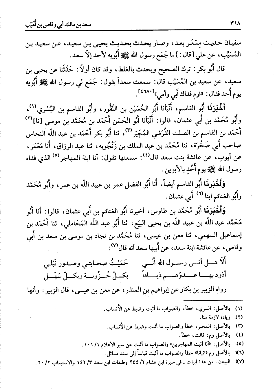 [4680] أخبرنا أبو القاسم أنبأنا أبو الحسين بن النقور وأبو القاسم بن البسري (1) وأبو محمد بن أبي عثمان قالوا أنبأنا أبو الحسن أحمد بن محمد بن موسى نا (2) أحمد بن القاسم بن الصلت القرشي المجبر (3) ثنا أبو بكر أحمد بن عبد الله النحاس صاحب أبي صخرة ثنا محمد بن عبد الملك بن زنجويه ثنا عبد الرزاق أنا معمر عن أيوب عن عائشة بنت سعد قال (4) سمعتها تقول أنا ابنة المهاجر (5) الذي فداه رسول الله (صلى الله عليه وسلم) يوم أحد بالأبوين وأخبرنا أبو القاسم أيضا أنا أبو الفضل عمر بن عبيد الله بن عمر وأبو محمد وأبو الغنائم ابنا (6) أبي عثمان وأخبرنا أبو محمد بن طاوس أخبرنا أبو الغنائم بن أبي عثمان قالوا أنا أبو محمد بن عبد الله بن عبيد الله بن يحيى البيع ثنا أبو عبد الله المحاملي ثنا أحمد بن إسماعيل السهمي ثنا معن بن عيسى ثنا محمد بن نجاد بن موسى بن سعد بن أبي وقاص عن عائشة ابنة سعد عن أبيها سعد أنه قال (7) * ألا هل أتى رسول الله أني * حميت صحابتي وصدور نبلي أذود بها عدوهم ذيادا * بكل خزونة وبكل حزونة وبكل سهل * رواه الزبير بن بكار عن إبراهيم بن المنذر عن معن بن عيسى قال الزبير وأنها
