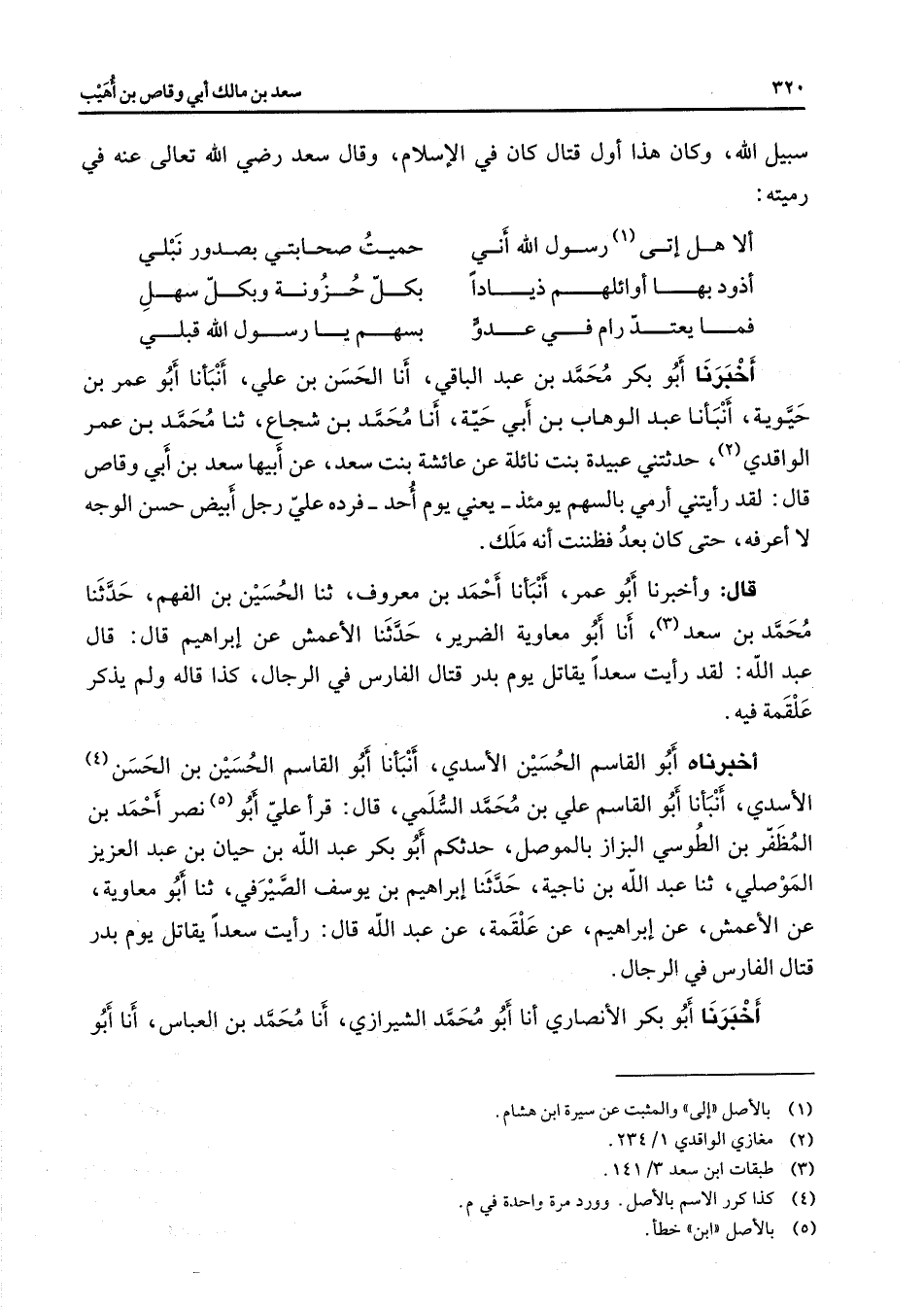 سبيل الله وكان هذا أول قتال كان في الإسلام وقال سعد رضي الله تعالى عنه في رميته * ألا هل إتى (1) رسول الله أني * حميت صحابتي بصدور نبلي أذود بها أوائلهم ذيادا * بكل حزونة وبكل سهل فما يعتد رام في عدو * بسهم يا رسول الله قبلي * أخبرنا أبو بكر محمد بن عبد الباقي أنا الحسن بن علي أنبأنا أبو عمر بن حيوية أنبأنا عبد الوهاب بنأبي حية أنا محمد بن شجاع ثنا محمد بن عمر الواقدي (2) حدثني عبيدة بنت نائلة عن عائشة بنت سعد عن أبيها سعد بن أبي وقاص قال لقد رأيتني أرمي بالسهم يومئذ يعني يوم أحد فرده علي رجل أبيض حسن الوجه لا أعرفه حتى كان بعد فظننت أنه ملك قال وأخبرنا أبو عمر أنبأنا أحمد بن معروف ثنا الحسين بن الفهم حدثنا محمد بن سعد (3) أنا أبو معاوية الضرير حدثنا الأعمش عن إبراهيم قال قال عبد الله لقد رأيت سعدا يقاتل يوم بدر قتال الفارس في الرجال كذا قاله ولم يذكر علقمة فيه أخبرناه أبو القاسم الحسين الأسدي أنبأنا أبو القاسم الحسين بن الحسن (4) الأسدي أنبأنا أبو القاسم علي بن محمد السلمي قال قرأ علي أبو (5) نصر أحمد بن المظفر بن الطوسي البزاز بالموصل حدثكم أبو بكر عبد الله بن حيان بن عبد العزيز الموصلي ثنا عبد الله بن ناجية حدثنا إبراهيم بن يوسف الصيرفي ثنا أبو معاوية عن الأعمش عن إبراهيم عن علقمة عن عبد الله قال رأيت سعدا يقاتل يوم بدر قتال الفارس في الرجال أخبرنا أبو بكر الأنصاري أنا أبو محمد الشيرازي أنا محمد بن العباس أنا أبو