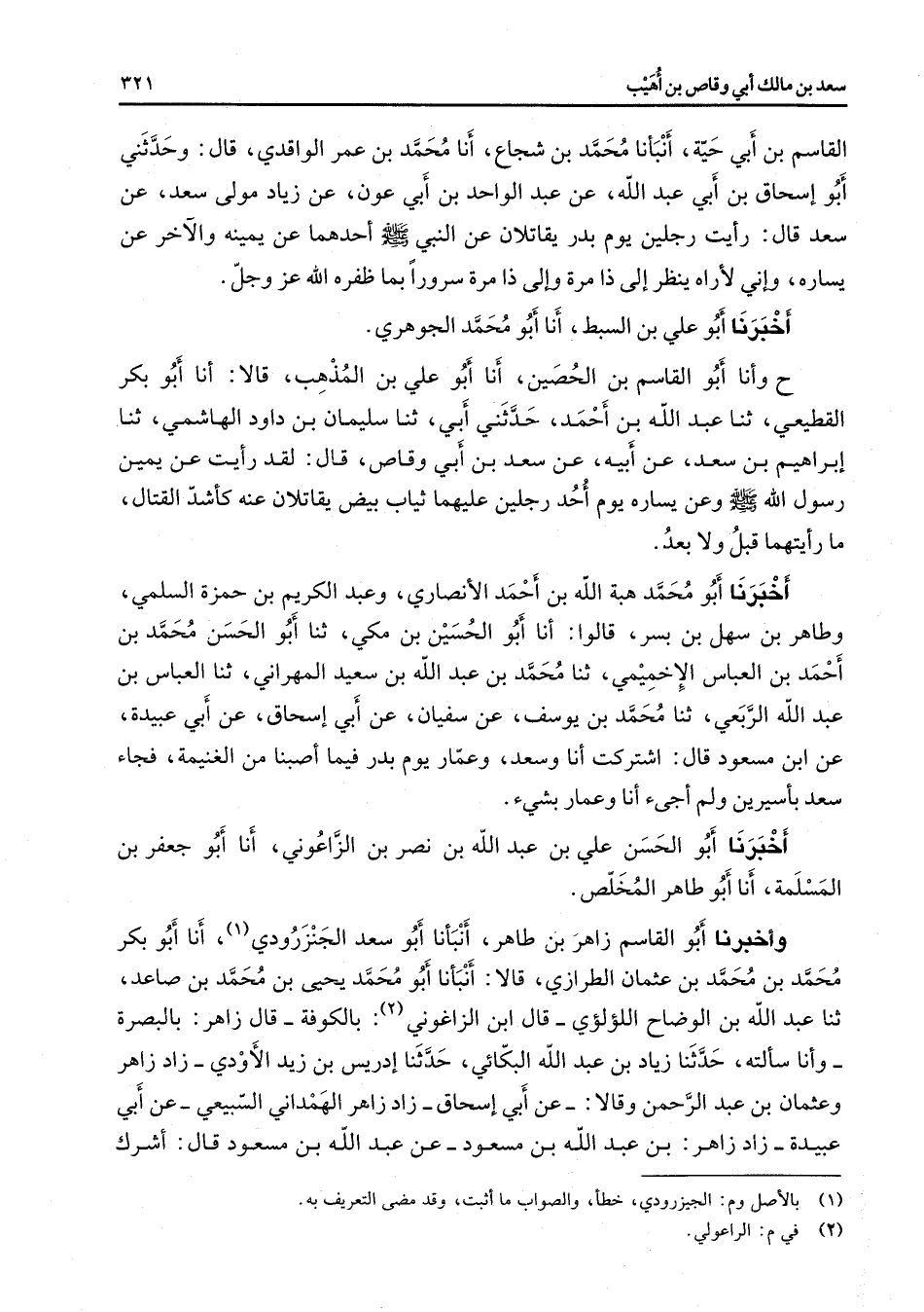 القاسم بن أبي حية أنبأنا محمد بن شجاع أنا محمد بن عمر الواقدي قال وحدثني أبو إسحاق بنأبي عبد الله عن عبد الواحد بن أبي عون عن زياد مولى سعد عن سعد قال رأيت رجلين يوم بدر يقاتلان عن النبي (صلى الله عليه وسلم) أحدهما عن يمينه والآخر عن يساره وإني لأراه ينظر إلى ذا مرة وإلى ذا مرة سرورا بما ظفره الله عز وجل أخبرنا أبو علي بن السبط أنا أبو محمد الجوهري ح وأنا أبو القاسم بن الحصين أنا أبو علي بن المذهب قالا أنا أبو بكر القطيعي ثنا عبد الله بن أحمد حدثني أبي ثنا سليمان بن داود الهاشمي ثنا إبراهيم بن سعد عنأبيه عن سعد بنأبي وقاص قال لقد رأيت عن يمين رسول الله (صلى الله عليه وسلم) وعن يساره يوم أحد رجلين عليهما ثياب بيض يقاتلان عنه كأشد القتال ما رأيتهما قبل ولا بعد أخبرنا أبو محمد هبة الله بنأحمد الأنصاري وعبد الكريم بن حمزة السلمي وطاهر بن سهل بن بسر قالوا أنا أبو الحسين بن مكي ثنا أبو الحسن محمد بن أحمد بن العباس الإخميمي ثنا محمد بن عبد الله بن سعيد المهراني ثنا العباس بن عبد الله الربعي ثنا محمد بن يوسف عن سفيان عن أبي إسحاق عن أبي عبيدة عن ابن مسعود قال اشتركت أنا وسعد وعمار يوم بدر فيما أصبنا من الغنيمة فجاء سعد بأسيرين ولم أجئ أنا وعمار بشئ أخبرنا أبو الحسن علي بن عبد الله بن نصر بن الزاعوني أنا أبو جعفر بن المسلمة أنا أبو طاهر المخلص وأخبرنا أبو القاسم زاهر بن طاهر أنبأنا أبو سعد الجنزرودي (1) أنا أبو بكر محمد بن محمد بن عثمان الطرازي قالا أنبأنا أبو محمد يحيى بن محمد بن صاعد ثنا عبد الله بن الوضاح اللؤلؤي قال ابن الزغواني (2) بالكوفة قال زاهر بالبصرة وأنا سألته حدثنا زياد بن عبد الله البكائي حدثنا إدريس بن زيد الأودي زاد زاهر وعثمان بن عبد الرحمن وقالا عنأبي إسحاق زاد زاهر الهمداني السبيعي عنأبي عبيدة زاد زاهر بن عبد الله بن مسعود عن عبد الله بن مسعود قال أشرك