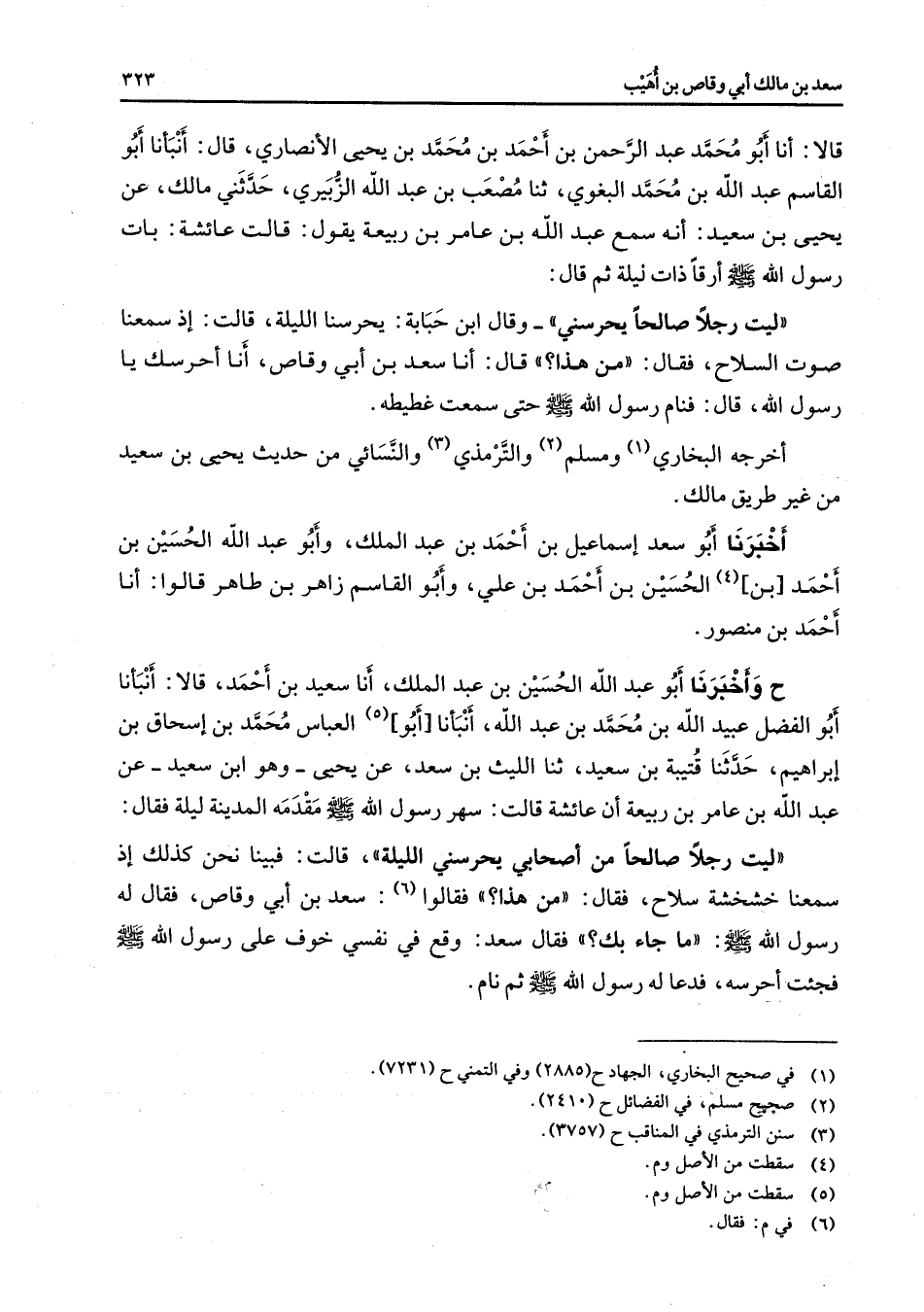 قالا أنا أبو محمد عبد الرحمن بن أحمد بن محمد بن يحيى الأنصاري قال أنبأنا أبو القاسم عبد الله بن محمد البغوي ثنا مصعب بن عبد الله الزبيري حدثني مالك عن يحيى بن سعيد أنه سمع عبد الله بن عامر بن ربيعة يقول قالت عائشة بات رسول الله (صلى الله عليه وسلم) أرقا ذات ليلة ثم قال ليت رجلا صالحا يحرسني وقال ابن حبابة يحرسنا الليلة قالت إذ سمعنا صوت السلاح فقال من هذا قال أنا سعد بنأبي وقاص أنا أحرسك يا رسول الله قال فنام رسول الله (صلى الله عليه وسلم) حتى سمعت غطيطه أخرجه البخاري (1) ومسلم (2) والترمذي (3) والنسائي من حديث يحيى بن سعيد من غير طريق مالك أخبرنا أبو سعد إسماعيل بنأحمد بن عبد الملك وأبو عبد الله الحسين بن أحمد بن (4) الحسين بنأحمد بن علي وأبو القاسم زاهر بن طاهر قالوا أنا أحمد بن منصور ح وأخبرنا أبو عبد الله الحسين بن عبد الملك أنا سعيد بن أحمد قالا انبأنا أبو الفضل عبيد الله بن محمد بن عبد الله أنبأنا أبو العباس (5) محمد بن إسحاق بن إبراهيم حدثنا قتيبة بن سعيد ثنا الليث بن سعد عن يحيى وهو ابن سعيد عن عبد الله بن عامر بن ربيعة أن عائشة قالت سهر رسول الله (صلى الله عليه وسلم) مقدمه المدينة ليلة فقال ليت رجلا صالحا من أصحابي يحرسني الليلة قالت فبينا نحن كذلك إذ سمعنا خشخشة سلاح فقال من هذا فقالوا (6) سعد بنأبي وقاص فقال له رسول الله (صلى الله عليه وسلم) ما جاء بك فقال سعد وقع في نفسي خوف على رسول الله (صلى الله عليه وسلم) فجئت أحرسه فدعا له رسول الله (صلى الله عليه وسلم) ثم نام