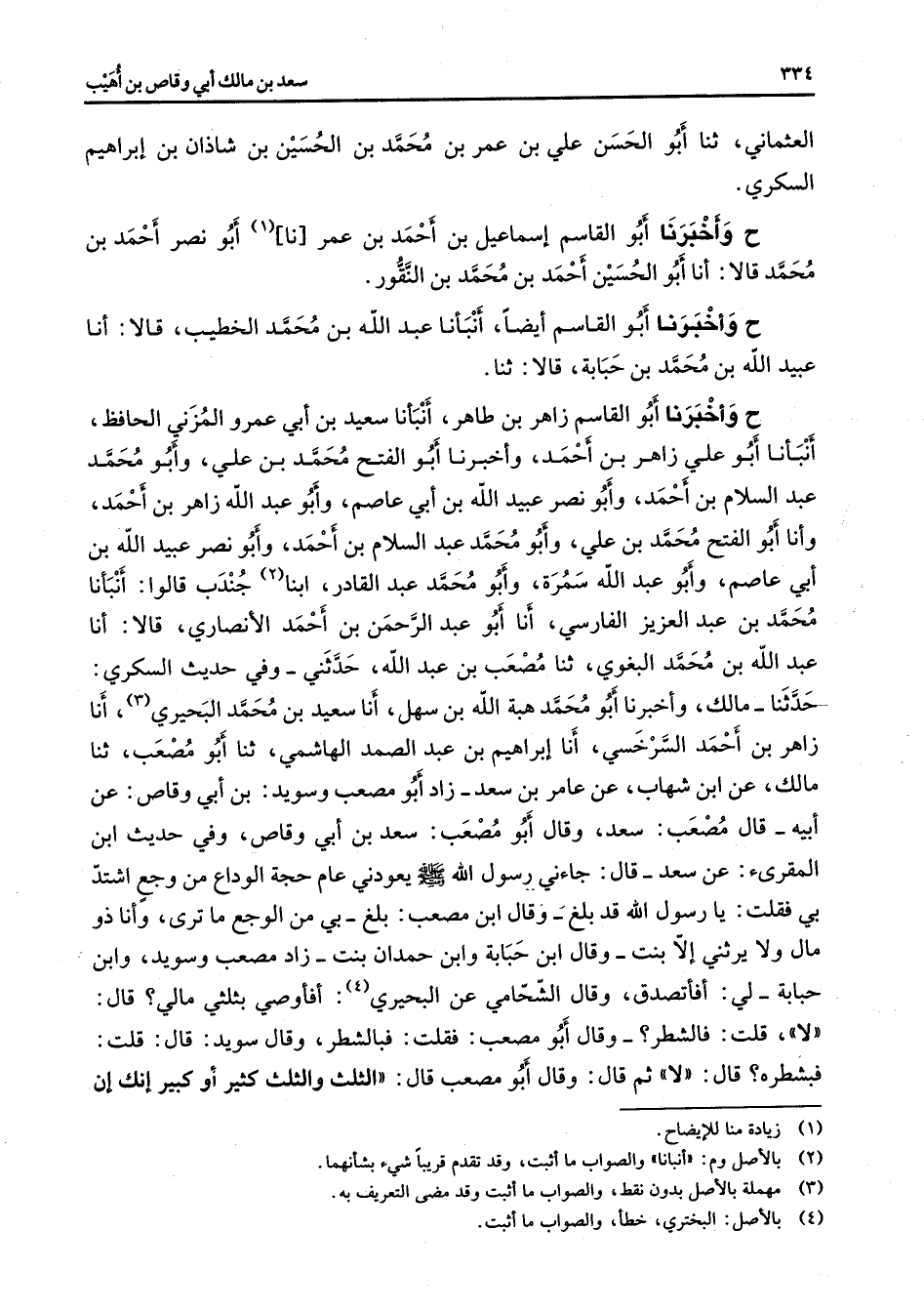 العثماني ثنا أبو الحسن علي بن عمر بن محمد بن الحسين بن شاذان بن إبراهيم السكري ح وأخبرنا أبو القاسم إسماعيل بن أحمد بن عمر نا (1) أبو نصر أحمد بن محمد قالا أنا أبو الحسين أحمد بن محمد بن النقور ح وأخبرنا أبو القاسم أيضا أنبأنا عبد الله بن محمد الخطيب قالا أنا عبيد الله بن محمد بن حبابة قالا ثنا ح وأخبرنا أبو القاسم زاهر بن طاهر أنبأنا سعيد بن أبي عمرو المزني الحافظ أنبأنا أبو علي زاهر بن أحمد وأخبرنا أبو الفتح محمد بن علي وأبو محمد عبد السلام بن أحمد وأبو نصر عبيد الله بن أبي عاصم وأبو عبد الله زاهر بن أحمد وأنا أبو الفتح محمد بن علي وأبو محمد عبد السلام بن أحمد وأبو نصر عبيد الله بن أبي عاصم وأبو عبد الله سمرة وأبو محمد عبد القادر ابنا (2) جندب قالوا أنبأنا محمد بن عبد العزيز الفارسي أنا أبو عبد الرحمن بن أحمد الأنصاري قالا أنا عبد الله بن محمد البغوي ثنا مصعب بن عبد الله حدثني وفي حديث السكري حدثنا مالك وأخبرنا أبو محمد هبة الله بن سهل أنا سعيد بن محمد البحيري (3) أنا زاهر بن أحمد السرخسي أنا إبراهيم بن عبد الصمد الهاشمي ثنا أبو مصعب ثنا مالك عن ابن شهاب عن عامر بن سعد زاد أبو مصعب وسويد بن أبي وقاص عن أبيه قال مصعب سعد وقال أبو مصعب سعد بن أبي وقاص وفي حديث ابن المقرئ عن سعد قال جاءني رسول الله (صلى الله عليه وسلم) يعودني عام حجة الوداع من وجع اشتد بي فقلت يا رسول الله قد بلغ وقال ابن مصعب بلغ بي من الوجع ما ترى وأنا ذو مال ولا يرثني إلا بنت وقال ابن حبابة وابن حمدان بنت زاد مصعب وسويد وابن حبابة لي أفأتصدق وقال الشحامي عن البحيري (4) أفأوصي بثلثي مالي قال لا قلت فالشطر وقال أبو مصعب فقلت فبالشطر وقال سويد قال قلت فبشطره قال لا ثم قال وقال أبو مصعب قال الثلث والثلث كثير أو كبير إنك إن