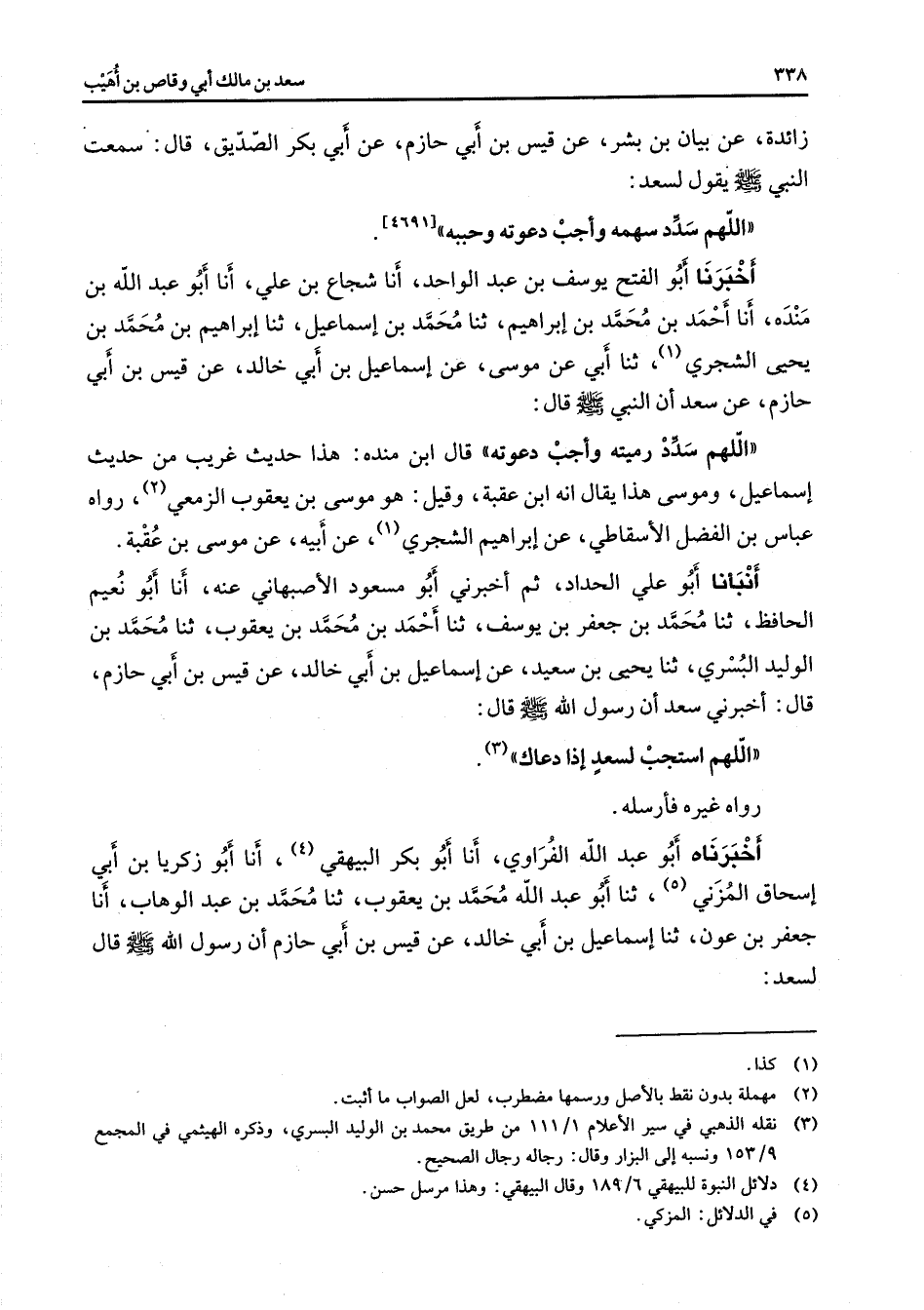 [4691] أخبرنا أبو الفتح يوسف بن عبد الواحد أنا شجاع بن علي أنا أبو عبد الله بن منده أنا أحمد بن محمد بن إبراهيم ثنا محمد بن إسماعيل ثنا إبراهيم بن محمد بن يحيى الشجري (1) ثنا أبي عن موسى عن إسماعيل بن أبي خالد عن قيس بن أبي حازم عن سعد أن النبي (صلى الله عليه وسلم) قال اللهم سدد رميته وأجب دعوته قال ابن منده هذا حديث غريب من حديث إسماعيل وموسى هذا يقال انه ابن عقبة هو موسى بن يعقوب الزمعي (2) رواه عباس بن الفضل الأسقاطي عن إبراهيم الشجري (2) عن أبيه عن موسى بن عقبة أنبأنا أبو علي الحداد ثم أخبرني أبو مسعود الأصبهاني عنه أنا أبو نعيم الحافظ ثنا محمد بن جعفر بن يوسف ثنا أحمد بن محمد بن يعقوب ثنا محمد بن الوليد البسري ثنا يحيى بن سعيد عن إسماعيل بن أبي خالد عن قيس بن أبي حازم قال أخبرني سعد أن رسول الله (صلى الله عليه وسلم) قال اللهم استجب لسعد إذا دعاك (3) رواه غيره فأرسله أخبرنا أبو عبد الله الفراوي أنا أبو بكر البيهقي (4) أنا أبو زكريا بن أبي إسحاق المزني ثنا أبو عبد الله محمد بن يعقوب ثنا محمد بن عبد الوهاب أنا جعفر بن عون ثنا إسماعيل بن أبي خالد عن قيس بن أبي حازم أن رسول الله (صلى الله عليه وسلم) قال لسعد