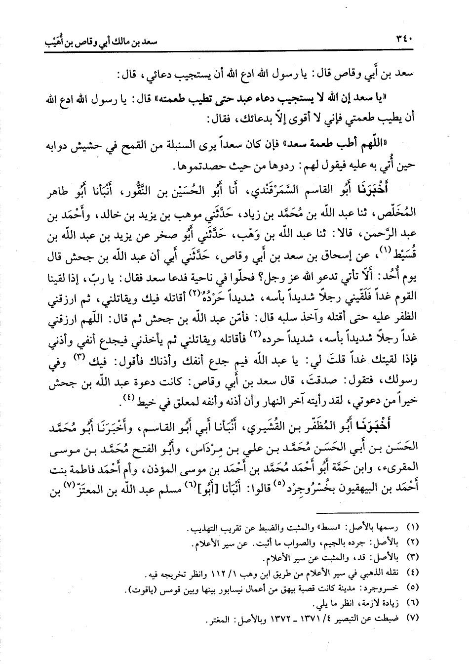 سعد بن أبي وقاص قال يا رسول الله أدع الله أن يستجيب دعائي قال يا سعد إن الله لا يستجيب دعاء عبد حتى تطيب طعمته قال يا رسول الله ادع الله أن يطيب طعمتي فإني لا أقوى إلا بدعائك فقال اللهم أطب طعمة سعد فإن كان سعدا يرى السنبلة من القمح في حشيش دوابه حين أتي به عليه فيقول لهم ردوها من حيث حصدتموها أخبرنا أبو القاسم السمرقندي أنا أبو الحسين بن النقور أنبأنا أبو طاهر المخلص ثنا عبد الله بن محمد بن زياد حدثني موهب بن يزيد بن خالد وأحمد بن عبد الرحمن قالا ثنا عبد الله بن وهب حدثني أبو صخر عن يزيد بن عبد الله بن قسيط (1) عن إسحاق بن سعد بن أبي وقاص حدثني أبي أن عبد الله بن جحش قال يوم أحد ألا تأتي تدعو الله عز وجل فحلوا في ناحية فدعا سعد فقال يا رب إذا لقينا القوم غدا فلقيني رجلا شديدا بأسه شديدا حرده (2) أقاتله فيك ويقاتلني ثم ارزقني الظفر عليه حتى أقتله وآخذ سلبه قال فأمن عبد الله بن جحش ثم قال اللهم ارزقني غدا رجلا شديدا بأسه شديدا حرده (2) فأقاتله ويقاتلني ثم يأخذني فيجدع أنفي وأذني فإذا لقيتك غدا قلت لي يا عبد الله فيم جدع أنفك وأذناك فأقول فيك (3) وفي رسولك فتقول صدقت قال سعد بنأبي وقاص كانت دعوة عبد الله بن جحش خيرا من دعوتي لقد رأيته آخر النهار وأن أذنه وأنفه لمعلق في خيط (4) أخبرنا أبو المظفر بن القشيري أنبأنا أبو القاسم وأخبرنا أبو محمد الحسن بن أبي الحسن محمد بن علي بن مرداس وأبو الفتح محمد بن موسى المقرئ وابن حمة أبو احمد محمد بن أحمد بن موسى المؤذن وأم أحمد فاطمة بنت أحمد بن البيهقيون بخسرو جرد (5) قالوا أنبأنا أبو (6) مسلم عبد الله بن المعتز (7) بن