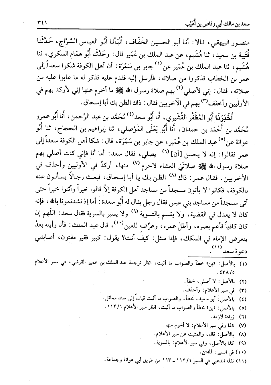 منصور البيهقي قالا أنا أبو الحسين الخفاف أنبأنا أبو العباس السراج حدثنا قتيبة بن سعيد ثنا هشيم عن عبد الملك بن عمير قال وحدثنا أبو همام السكري ثنا هشيم ثنا عبد الملك بن عمير عن (1) جابر بن سمرة أن أهل الكوفة شكوا سعدا إلى عمر بن الخطاب فذكروا من صلاته فأرسل إليه فقدم عليه فذكر له ما عابوا عليه من صلاته فقال إني لأصلي (3) بهم صلاة رسول الله (صلى الله عليه وسلم) ما أخرم عنها إني لأركد بهم في الأولين وأخفف بهم في الآخرين فقال ذاك الظن بك أبا إسحاق أخبرنا أبو المظفر القشيري أنا أبو سعد (4) محمد بن عبد الرحمن أنا أبو عمرو محمد بن أحمد بن حمدان أنا أبو يعلى الموصلي ثنا إبراهيم بن الحجاج ثنا أبو عوانة عن (5) عبد الملك بن عمير عن جابر بن سمرة قال شكا أهل الكوفة سعدا إلى عمر فقالوا إنه لا يحسن أن (6) يصلي فقال سعد أما أنا فإني كنت أصلي بهم صلاة رسول الله (صلى الله عليه وسلم) صلاتي العشاء لا حرم (7) منها أركد في الأوليين وأحذف في الأخريين فقال عمر ذاك (8) الظن بك يا أبا إسحاق فبعث رجالا يسألون عنه بالكوفة فكانوا لا يأتون مسجدا من مساجد أهل الكوفة إلا قالوا خيرا وأثنوا خيرا حتى أتى مسجدا من مساجد بني عبس فقال رجل يقال له أبو سعدة أما إذ نشدتمونا بالله فإنه كان لا يعدل في القضية ولا يقسم بالتسوية (9) ولا يسير بالسرية فقال سعد اللهم إن كان كاذبا فأعم بصره وأطل عمره وعرضه للعين (10) قال عبد الملك فأنا رأيته بعد يتعرض الإماء في السكك فإذا سئل كيف أنت يقول كبير فقير مفتون أصابتني دعوة سعد (11)