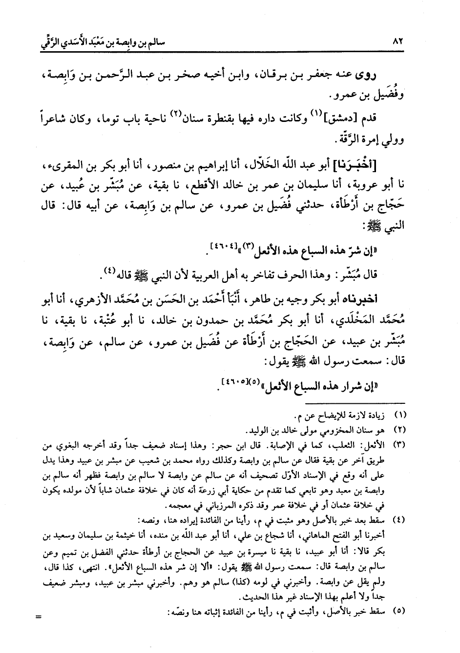 [4604] قال مبشر وهذا الحرف تفاخر به أهل العربية لأن النبي (صلى الله عليه وسلم) قاله (4) أخبرناه أبو بكر وجيه بن طاهر أنبأ أحمد بن الحسن بن محمد الأزهري أنا أبو محمد المخلدي أنا أبو بكر محمد بن حمدون بن خالد نا أبو عتبة نا بقية نا مبشر بن عبيد عن الحجاج بن أرطأة عن فضيل بن عمرو عن سالم عن وابصة قال سمعت رسول الله (صلى الله عليه وسلم) يقول إن شرار هذه السباع الأثعل (5)