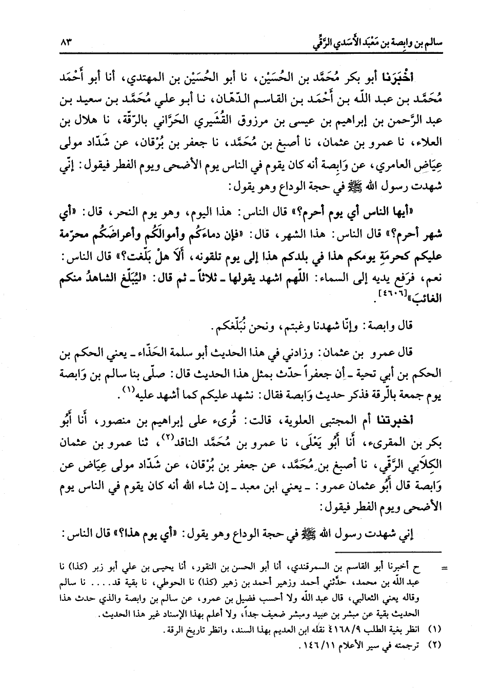 أخبرنا أبو بكر محمد بن الحسين نا أبو الحسين بن المهتدي أنا أبو أحمد محمد بن عبد الله بن أحمد بن القاسم الدهان نا أبو علي محمد بن سعيد بن عبد الرحمن بن إبراهيم بن عيسى بن مرزوق القشيري الحراني بالرقة نا هلال بن العلاء نا عمرو بن عثمان نا أصبغ بن محمد نا جعفر بن برقان عن شداد مولى عياض العامري عن وابصة أنه كان يقوم في الناس يوم يوم الأضحى ويوم الفطر فيقول إني شهدت رسول الله (صلى الله عليه وسلم) في حجة الوداع وهو يقول أيها الناس أي يوم أحرم قال الناس هذا اليوم وهو يوم النحر قال أي شهر أحرم قال الناس هذا الشهر قال فإن دماءكم وأموالكم وأعراضكم محرمة عليكم كحرمة يومكم هذا في بلدكم هذا إلى يوم تلقونه ألا هل بلغت قال الناس نعم فرفع يديه إلى السماء اللهم اشهد يقولها ثلاثا ثم قال ليبلغ الشاهد منكم الغائب (4606) قال وابصة وإنا شهدنا وغبتم ونحن نبلغكم قال عمرو بن عثمان وزادني في هذا الحديث أبو سلمة الحذاء يعني الحكم بن الحكم بن أبي تحية أن جعفرا حدث بمثل هذا الحديث قال صلى بنا سالم بن وابصة يوم جمعة بالرقة فذكر حديث وابصة فقال نشهد عليكم كما أشهد عليه (1) أخبرتنا أم المجتبى العلوية قالت قرئ على إبراهيم بن منصور أنا أبو بكر بن المقرئ أنا أبو يعلى نا عمرو بن محمد الناقد (2) ثنا عمرو بن عثمان الكلابي الرقي نا أصبغ بن محمد عن جعفر بن برقان عن شداد مولى عياض عن وابصة قال أبو عثمان عمرو يعني ابن معبد إن شاء الله أنه كان يقوم في الناس يوم الأضحى ويوم الفطر فيقول إني شهدت رسول الله (صلى الله عليه وسلم) في حجة الوداع وهو يقول أي يوم هذا قال الناس