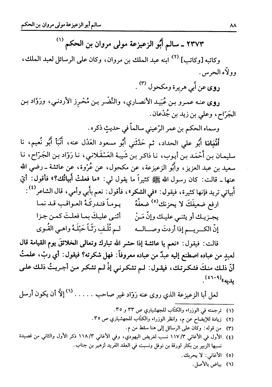 2373 - سالم أبو الزعيزعة مولى مروان بن الحكم (1) وكاتبه وكاتب (2) ابنه عبد الملك بن مروان وكان على الرسائل لعبد الملك وولاه الحرس روى عن أبي هريرة ومكحول (3) روى عنه عمرو بن عبيد الأنصاري والنضر بن محرز الأردني ورواد بن الجراح وعلي بن زيد بن جدعان وسماه الحكم بن عمر الرعيني سالما في حديث ذكره أنبأنا أبو علي الحداد ثم حدثني أبو مسعود العدل عنه أنبأ أبو نعيم نا سليمان بن أحمد بن أيوب نا ذاكر بن شيبة العسقلاني نا رواد بن الجراح نا سعيد بن عبد العزيز وأبو الزعيزعة عن مكحول عن عروة عن عائشة Bها قالت كان رسول الله (صلى الله عليه وسلم) كثيرا ما يقول لي ما فعلت أبياتك فأقول أي أبياتي تريد فإنها كثيرة فيقول في الشكر فأقول نعم بأبي وأمي قال الشاعر (4) * ارفع ضعيفك لا يحزنك (5) ضعفه * يوما فتدركه العواقب قد نما يجزيك أو يثني عليك وإن من * أثنى عليك بما فعلت كمن جزا إن الكريم إذا أردت وصاله * لم تلف رثا حبله واهي القوى * قالت فيقول نعم يا عائشة إذا حشر الله تبارك وتعالى الخلائق يوم القيامة قال لعبد من عباده اصطنع إليه عبد من عباده معروفا فهل شكرته فيقول أي رب علمت أن ذلك منك فشكرتك فيقول لم تشكرني إذ لم تشكر من أجريت ذلك على يديهح (4609) لعل أبا الزعيزعة الذي روى عنه رواد غير صاحب (6) إلا أن يكون أرسل