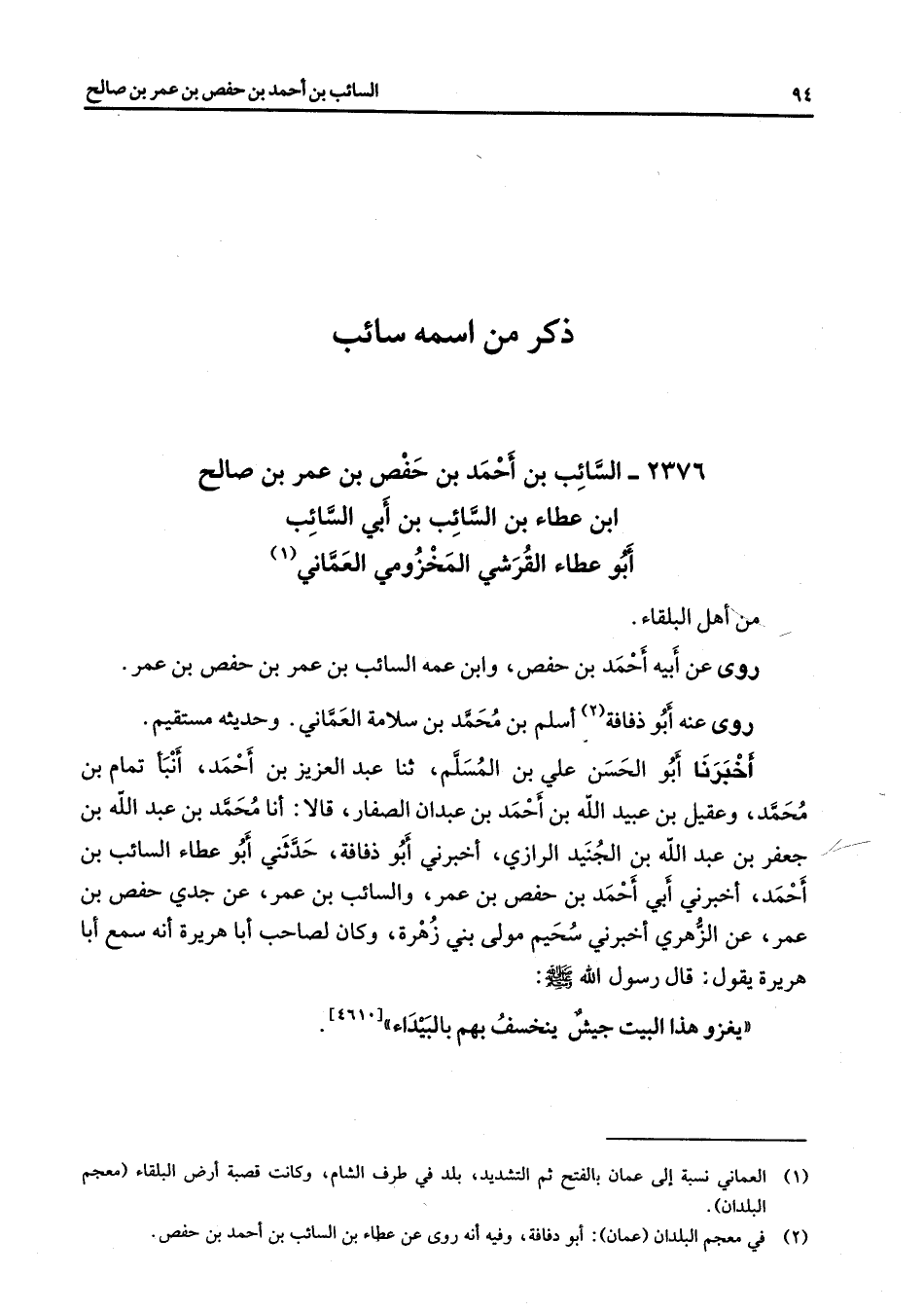2376 - السائب بن أحمد بن حفص بن عمر بن صالح ابن عطاء بن السائب بن أبي السائب أبو عطاء القرشي المخزومي العماني من أهل البلقاء روى عن أبيه أحمد بن حفص وابن عمه السائب بن عمر بن حفص بن عمر روى عنه أبو ذفافة (2) أسلم بن محمد بن سلامة العماني وحديثه مستقيم أخبرنا أبو الحسن علي بن المسلم ثنا عبد العزيز بن أحمد أنبأ تمام بن محمد وعقيل بن عبيد الله بن أحمد بن عبدان الصفار قالا أنا محمد بن عبد الله بن جعفر بن عبد الله بن الجنيد الرازي أخبرني أبو ذفافة حدثني أبو عطاء السائب بن أحمد أخبرني أبي أحمد بن حفص بن عمر والسائب بن عمر عن جدي حفص بن عمر عن الزهري أخبرني سحيم مولى بني زهرة وكان لصاحب أبا هريرة أنه سمع أبا هريرة يقول قال رسول الله (صلى الله عليه وسلم) يغزو هذا البيت جيش ينخسف بهم بالبيداء (4610)