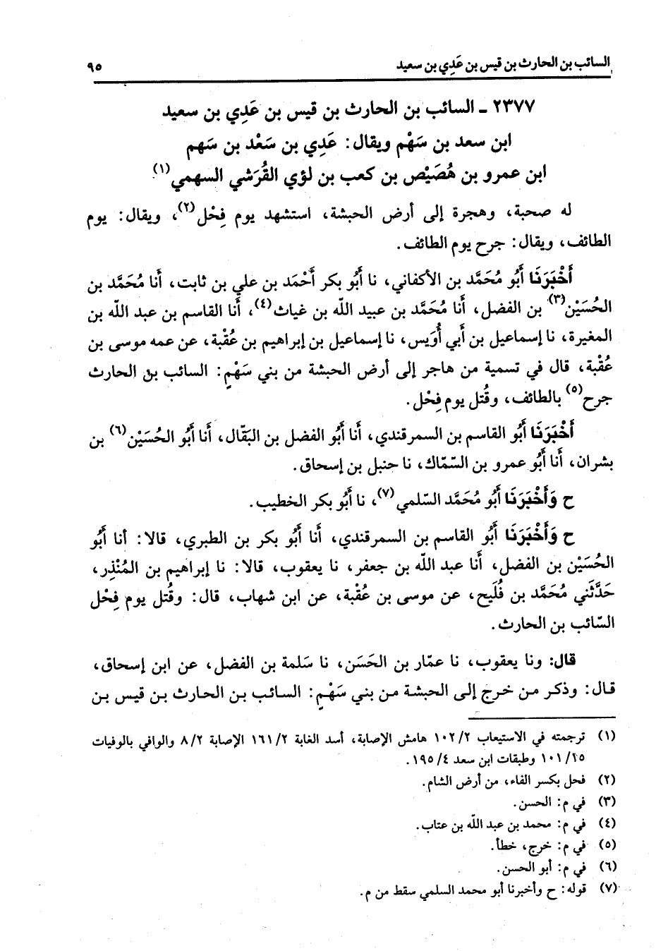 2377 - السائب بن الحارث بن قيس بن عدي بن سعيد ابن سعد بن سهم ويقال عدي بن سعد بن سهم ابن عمرو بن هصيص بن كعب بن لؤي القرشي السهمي (1) له صحبة وهجرة إلى أرض الحبشة استشهد يوم فحل (2) ويقال يوم الطائف ويقال جرح يوم الطائف أخبرنا أبو محمد بن الأكفاني نا أبو بكر أحمد بن علي بن ثابت أنا محمد بن الحسين (3) بن الفضل أنا محمد بن عبيد الله بن غياث (4) أنا القاسم بن عبد الله بن المغيرة نا إسماعيل بن أبي أويس نا إسماعيل بن إبراهيم بن عقبة عن عمه موسى بن عقبة قال في تسمية من هاجر إلى أرض الحبشة من بني سهم السائب بن الحارث جرح (5) بالطائف وقتل يوم فحل أخبرنا أبو القاسم بن السمرقندي أنا أبو الفضل بن البقال أنا أبو الحسين (6) بن بشران أنا أبو عمرو بن السماك نا حنبل بن إسحاق ح وأخبرنا أبو محمد السلمي (7) نا أبو بكر الخطيب ح وأخبرنا أبو القاسم بن السمرقندي أنا أبو بكر بن الطبري قالا أنا أبو الحسين بن الفضل أنا عبد الله بن جعفر نا يعقوب قالا نا إبراهيم بن المنذر حدثني محمد بن فليح عن موسى بن عقبة عن ابن شهاب قال وقتل يوم فحل السائب بن الحارث قال ونا يعقوب نا عمار بن الحسن نا سلمة بن الفضل عن ابن إسحاق قال وذكر من خرج إلى الحبشة من بني سهم السائب بن الحارث بن قيس بن