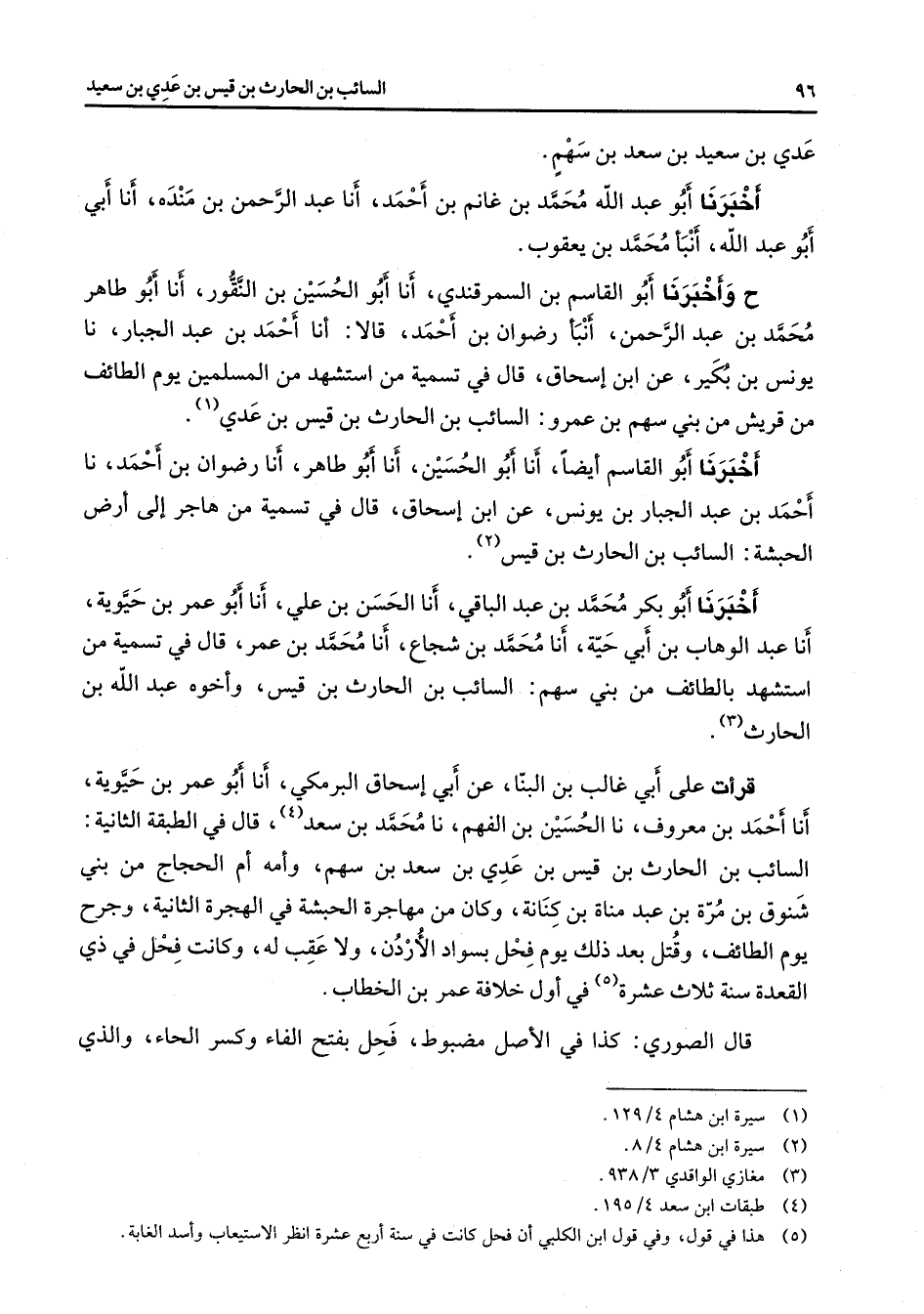 عدي بن سعيد بن سعد بن سهم أخبرنا أبو عبد الله محمد بن غانم بن أحمد أنا عبد الرحمن بن منده أنا أبي أبو عبد الله أنبأ محمد بن يعقوب ح وأخبرنا أبو القاسم بن السمرقندي أنا أبو الحسين بن النقور أنا أبو طاهر محمد بن عبد الرحمن أنبأ رضوان بن أحمد قالا أنا احمد بن عبد الجبار نا يونس بن بكير عن ابن إسحاق قال في تسمية من استشهد من المسلمين يوم الطائف من قريش من بني سهم بن عمرو السائب بن الحارث بن قيس بن عدي (1) أخبرنا أبو القاسم أيضا أنا أبو الحسين أنا أبو طاهر أنا رضوان بن أحمد نا أحمد بن عبد الجبار بن يونس عن ابن إسحاق قال في تسمية من هاجر إلى أرض الحبشة السائب بن الحارث بن قيس (2) أخبرنا أبو بكر محمد بن عبد الباقي أنا الحسن بن علي أنا أبو عمر بن حيوية أنا عبد الوهاب بن أبي حية أنا محمد بن شجاع أنا محمد بن عمر قال في تسمية من استشهد بالطائف من بني سهم السائب بن الحارث بن قيس وأخوه عبد الله بن الحارث (3) قرأت على أبي غالب بن البنا عن أبي إسحاق البرمكي أنا أبو عمر بن حيوية أنا أحمد بن معروف نا الحسين بن الفهم نا محمد بن سعد (4) قال في الطبقة الثانية السائب بن الحارث بن قيس بن عدي بن سعد بن سهم وأمه أم الحجاج من بني شنوق بن مرة بن عبد مناة بن كنانة وكان من مهاجرة الحبشة في الهجرة الثانية وجرح يوم الطائف وقتل بعد ذلك يوم فحل بسواد الأردن ولا عقب له وكانت فحل في ذي القعدة سنة ثلاث عشرة (5) في أول خلافة عمر بن الخطاب قال الصوري كذا في الأصل مضبوط فحل بفتح الفاء وكسر الحاء والذي