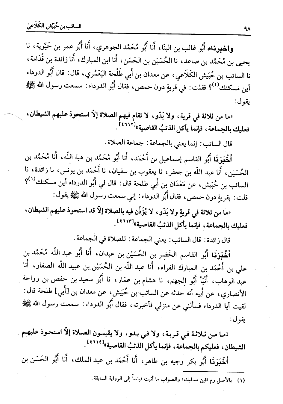 وأخبرناه أبو غالب بن البنا أنا أبو محمد الجوهري أنا أبو عمر بن حيوية نا يحيى بن محمد بن صاعد نا الحسين بن الحسن أنا ابن المبارك أنا زائدة بن قدامة نا السائب بن حبيش الكلاعي عن معدان بن أبي طلحة اليعمري قال قال أبو الدرداء أين مسكنك (4) فقلت في قرية دون حمص فقال أبو الدرداء سمعت رسول الله (صلى الله عليه وسلم) يقول ما من ثلاثة في قرية ولا بدو لا تقام فيهم الصلاة إلا استحوذ عليهم الشيطان فعليك بالجماعة فإنما يأكل الذئب القاصية (4612) قال السائب إنما يعني بالجماعة جماعة الصلاة أخبرنا أبو القاسم إسماعيل بن أحمد أنا أبو محمد بن هبة الله أنا محمد بن الحسين أنا عبد الله بن جعفر نا يعقوب بن سفيان نا أحمد بن يونس نا زائدة نا السائب بن حبيش عن معدان بن أبي طلحة قال قال لي أبو الدرداء أين مسكنك (1) قلت بقرية دون حمص فقال أبو الدرداء إني سمعت رسول الله (صلى الله عليه وسلم) يقول ما من ثلاثة في قرية ولا بدو لا يؤذن فيه بالصلاة إلا قد استحوذ عليهم الشيطان فعليك بالجماعة فإنما يأكل الذئب القاصية (4613) قال زائدة قال السائب يعني الجماعة للصلاة في الجماعة أخبرنا أبو القاسم الخضر بن الحسين بن عبدان أنا أبو عبد الله محمد بن علي بن أحمد بن المبارك الفراء أنا عبد الله بن الحسين بن عبيد الله الصفار أنا عبد الوهاب أنبأ أبو الجهم نا هشام بن عمار نا أبو سعيد بن حفص بن رواحة الأنصاري عن أبيه أنه حدثه عن السائب بن حبيش عن معدان بن أبي طلحة قال لقيت أبا الدرداء فسألني عن منزلي فأخبرته فقال أبو الدرداء سمعت رسول الله (صلى الله عليه وسلم) يقول ما من ثلاثة في قرية ولا في بدو ولا يقيمون الصلاة إلا استحوذ عليهم الشيطان فعليكم بالجماعة فإنما يأكل الذئب القاصية (4614) أخبرنا أبو بكر وجيه بن طاهر أنا أحمد بن عبد الملك أنا أبو الحسن بن