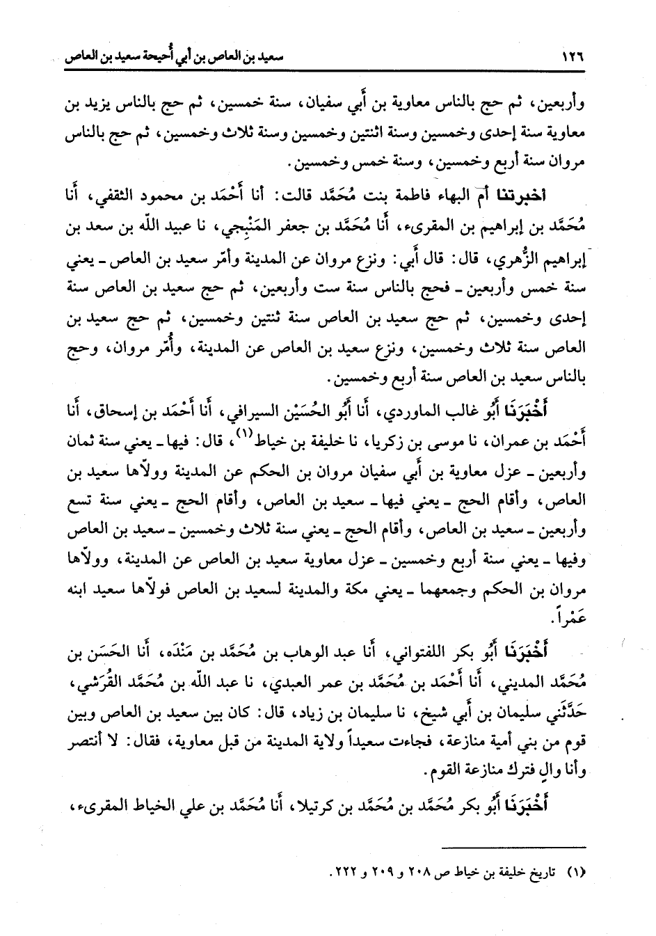 وأربعين ثم حج بالناس معاوية بن أبي سفيان سنة خمسين ثم حج بالناس يزيد بن معاوية سنة إحدى وخمسين وسنة اثنتين وخمسين وسنة ثلاث وخمسين ثم حج بالناس مروان سنة وخمسين وسنة خمس وخمسين أخبرتنا أم البهاء فاطمة بنت محمد قالت أنا أحمد بن محمود الثقفي أنا محمد بن إبراهيم بن المقرئ أنا محمد بن جعفر المنبجي نا عبيد الله بن سعد بن إبراهيم الزهري قال قال أبي ونزع مروان عن المدينة وأمر سعيد بن العاص يعني سنة خمس وأربعين فحج بالناس سنة ست وأربعين ثم حج سعيد بن العاص سنة إحدى وخمسين ثم حج سعيد بن العاص سنة ثنتين وخمسين ثم حج سعيد بن العاص سنة ثلاث وخمسين ونزع سعيد بن العاص عن المدينة وأمر مروان وحج بالناس سعيد بن العاص سنة أربع وخمسين أخبرنا أبو غالب الماوردي أنا أبو الحسين السيرافي أنا أحمد بن إسحاق أنا أحمد بن عمران نا موسى بن زكريا نا خليفة بن خياط (1) قال فيها يعني سنة ثمان وأربعين عزل معاوية بن أبي سفيان مروان بن الحكم عن المدينة وولاها سعيد بن العاص وأقام الحج يعني فيها سعيد بن العاص وأقام الحج يعني سنة تسع وأربعين سعيد بن العاص وأقام الحج يعني سنة ثلاث وخمسين سعيد بن العاص وفيها يعني سنة أربع وخمسين عزل معاوية سعيد بن العاص عن المدينة وولاها مروان بن الحكم وجمعهما يعني مكة والمدينة لسعيد بن العاص فولاها سعيد ابنه عمرا أخبرنا أبو بكر اللفتواني أنا عبد الوهاب بن محمد أنا الحسن بن محمد المديني أنا أحمد بن محمد بن عمر العبدي نا عبد الله بن محمد القرشي حدثني سليمان بن أبي شيخ نا سليمان بن زياد قال كان بين سعيد بن العاص وبين قوم من بني أمية منازعة فجاءت سعيدا ولاية المدينة من قبل معاوية فقال لا أنتصر وأنا وال منازعة القوم أخبرنا أبو بكر محمد بن محمد بن كرتيلا أنا محمد بن علي الخياط المقرئ