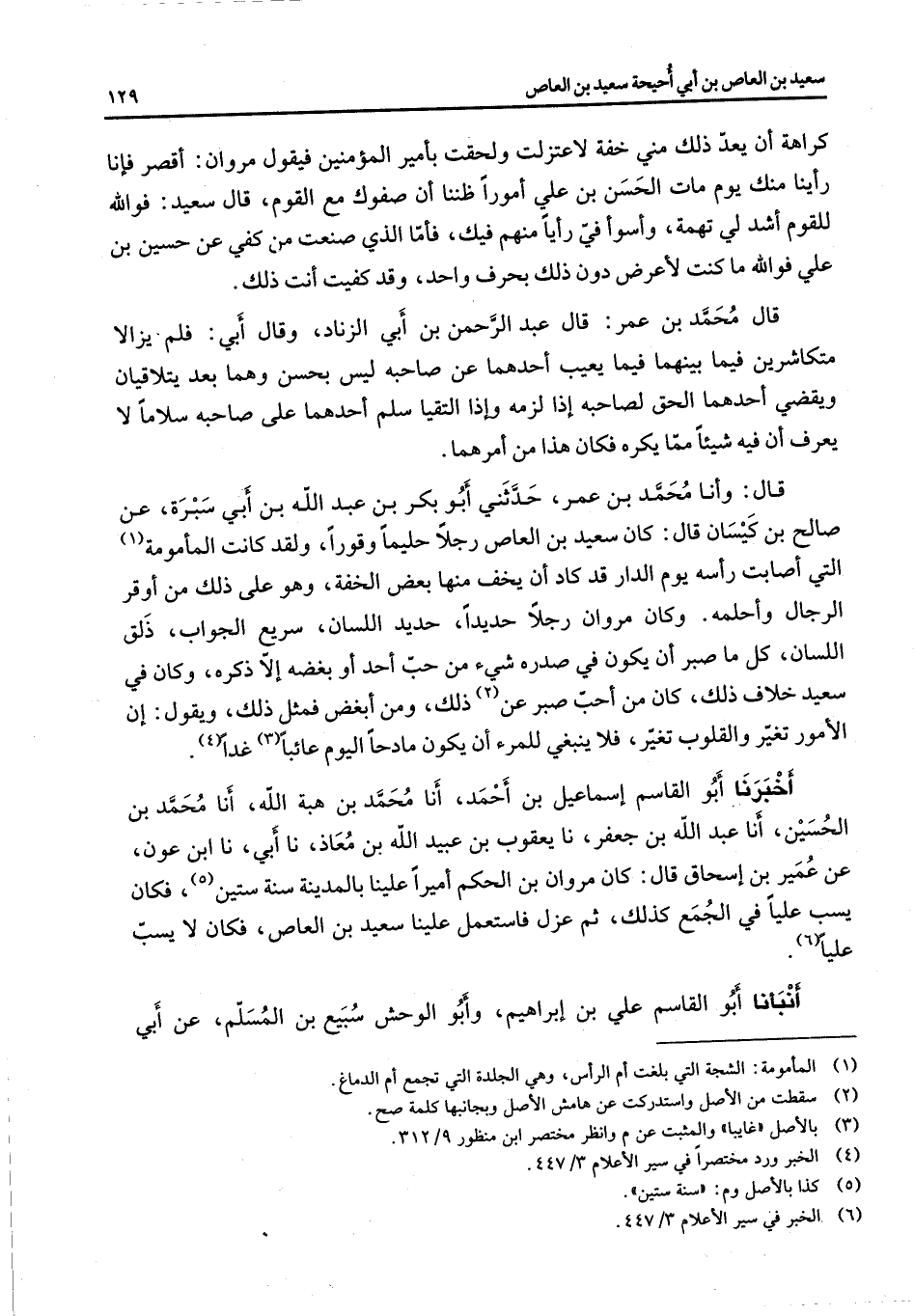 كراهة أن يعد ذلك من خفة لاعتزلت ولحقت بأمير المؤمنين فيقول مروان أقصر فإنا رأينا منك يوم مات الحسن بن علي أمورا ظننا أن صفوك مع القوم قال سعيد فوالله للقوم أشد لي تهمة وأسوأفي رأيا منهم فيك فأما الذي صنعت من كفي عن حسين بن علي فوالله ما كنت لأعرض دون ذلك بحرف واحد وقد كفيت أنت ذلك قال محمد بن عمر قال عبد الرحمن بن أبي الزناد وقال أبي فلم يزالا متكاشرين فيما بينهما فيما يعيب أحدهما عن صاحبه ليس بحسن وهما بعد يتلاقيان ويقضي أحدهما الحق لصاحبه إذا لزمه وإذا التقيا سلم أحدهما على صاحبه سلاما لا يعرف أن فيه شيئا مما يكره فكان هذا من أمرهما قال وأنا محمد بن عمر حدثني أبو بكر بن عبد الله بن أبي سبرة عن صالح بن كيسان قال كان سعيد بن العاص رجلا حليما وقورا ولقد كانت المأمومة (1) التي أصابت رأسه يوم الدار قد كاد أن يخف منها بعض الخفة وهو على ذلك من أوقر الرجال وأحلمه وكان مروان رجلا حديدا حديد اللسان سريع الجواب ذلق اللسان كل ما صبر أن يكون في صدره شئ من حب أحد أو بغضه إلا ذكره وكان في سعيد خلاف ذلك كان من أحب صبر عن (2) ذلك ومن أبغض فمثل ذلك ويقول إن الأمور تغير والقلوب تغير فلا ينبغي للمرء أن يكون مادحا اليوم عائبا (3) غدا (4) أخبرنا أبو القاسم إسماعيل بن أحمد أنا محمد بن هبة الله أنا محمد بن الحسين أنا عبد الله بن جعفر نا يعقوب بن عبيد الله بن معاذ نا أبي نا ابن عون عن عمير بن إسحاق قال كان مروان بن الحكم أميرا علينا بالمدينة سنة ستين (5) فكان يسب عليا في الجمع كذلك ثم عزل فاستعمل علينا سعيد بن العاص فكان لا يسب عليا (6) أنبأنا أبو القاسم علي بن إبراهيم وأبو الوحش سبيع بن المسلم عن أبي