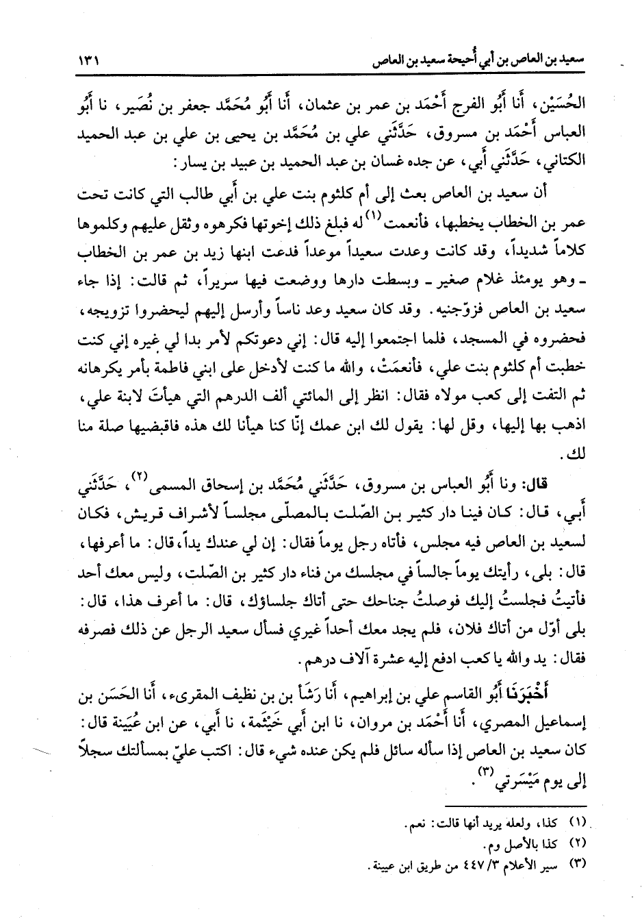 الحسين أنا أبو الفرج أحمد بن عمر بن عثمان أنا أبو محمد جعفر بن نصير نا أبو العباس أحمد بن مسروق حدثني علي بن محمد بن يحيى بن علي بن عبد الحميد الكتاني حدثني أبي عن جده غسان بن عبد الحميد بن عبيد بن يسار أن سعيد بن العاص بعث إلى أم كلثوم بنت علي بن أبي طالب التي كانت تحت عمر بن الخطاب يخطبها فأنعمت (1) له فبلغ ذلك إخوتها فكرهوه وثقل عليهم وكلموها كلاما شديدا وقد كانت وعدت سعيدا موعدا فدعت ابنها زيد بن عمر بن الخطاب وهو يومئذ غلام صغير وبسطت دارها ووضعت فيها سريرا ثم قالت إذا جاء سعيد بن العاص فزوجنيه وقد كان سعيد وعد ناسا وأرسل إليهم ليحضروا تزويجه فحضروه في المسجد فلما اجتمعوا إليه قال إني دعوتكم لأمر بدا لي غيره إني كنت خطبت أم كلثوم بنت علي فأنعمت والله ما كنت لأدخل على ابني فاطمة بأمر يكرهانه ثم التفت إلى كعب مولاه فقال انظر إلى المائتي ألف الدرهم التي هيأت لابنة علي اذهب بها إليها وقل لها يقول لك ابن عمك إنا كنا هيأنا لك هذه فاقبضيها صلة منا لك قال ونا أبو العباس بن مسروق حدثني محمد بن إسحاق المسمى (2) حدثني أبي قال كان فينا دار كثير بن الصلت بالمصلى مجلسا لأشراف قريش فكان لسعيد بن العاص فيه مجلس فأتاه رجل يوما فقال إن لي عندك يدا قال ما أعرفها قال بلى رأيتك يوما جالسا في مجلسك من فناء دار كثير بن الصلت وليس معك أحد فأتيت فجلست إليك فوصلت جناحك حتى أتاك جلساؤك قال ما أعرف هذا قال بلى أول من أتاك فلان فلم يجد معك أحدا غيري فسأل سعيد الرجل عن ذلك فصرف فقال يد والله يا كعب ادفع إليه عشرة آلاف درهم أخبرنا أبو القاسم علي بن إبراهيم أنا رشأ بن بن نظيف المقرئ أنا الحسن بن إسماعيل المصري أنا أحمد بن مروان نا ابن أبي خيثمة نا أبي عن ابن عيينة قال كان سعيد بن العاص إذا سأله سائل فلم يكن عنده شئ قال اكتب علي بمسألتك سجلا إلى يوم ميسرتي (3)