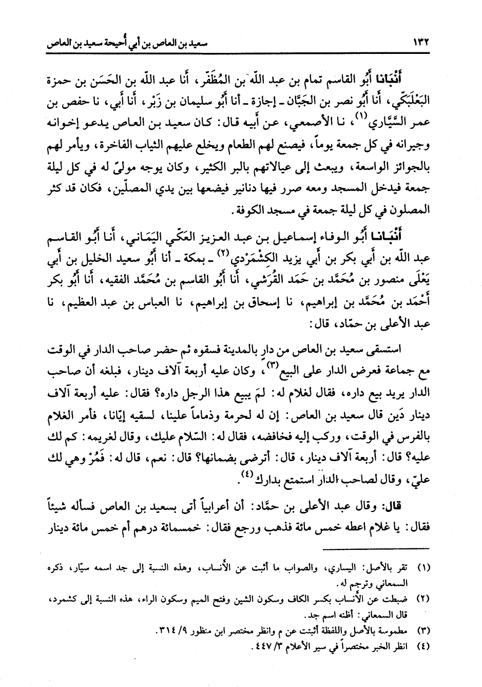 أنبأنا أبو القاسم تمام بن عبد الله بن المظفر أنا عبد الله بن الحسن بن حمزة البعلبكي أنا أبو نصر بن الجبان إجازة أنا أبو سليمان بن زبر أنا أبي نا حفص بن عمر السياري (1) نا الأصمعي عن أبيه قال كان سعيد بن العاص يدعو إخوانه وجيرانه في كل جمعة يوما فيصنع لهم الطعام ويخلع عليهم الثياب الفاخرة ويأمر لهم بالجوائز الواسعة ويبعث إلى عيالاتهم بالبر الكثير وكان يوجه مولى له في كل ليلة جمعة فيدخل المسجد ومعه صرر فيها دنانير فيضعها بين يدي المصلين فكان قد كثر المصلون في كل ليلة جمعة في مسجد الكوفة أنبأنا أبو الوفاء إسماعيل بن عبد العزيز العكي اليماني أنا أبو القاسم عبد الله بن أبي بكر بن أبي يزيد الكشمردي (2) بمكة أنا أبو سعيد الخليل بن أبي يعلى منصور بن محمد بن حمد القرشي أنا أبو القاسم بن محمد الفقيه أنا أبو بكر أحمد بن محمد بن إبراهيم نا إسحاق بن إبراهيم نا العباس بن عبد العظيم نا عبد الأعلى بن حماد قال استسقى سعيد بن العاص من دار بالمدينة فسقوه ثم حضر صاحب الدار في الوقت مع جماعة فعرض الدار على البيع (3) وكان عليه أربعة آلاف دينار فبلغه أن صاحب الدار يريد بيع داره فقال لغلام له لم يبيع هذا الرجل داره فقال عليه أربعة آلاف دينار دين قال سعيد بن العاص إن له لحرمة وذماما علينا لسقيه إيانا فأمر الغلام بالفرس في الوقت وركب إليه فخافضه فقال له السلام عليك وقال لغريمه كم لك عليه قال أربعة آلاف دينار قال أترضى بضمانها قال نعم قال له فمر وهي لك علي وقال لصاحب الدار استمتع بدارك (4) قال وقال عبد الأعلى بن حماد أن أعرابيا أتى بسعيد بن العاص فسأله شيئا فقال يا غلام اعطه خمس مائة فذهب ورجع فقال خمسمائة درهم أم خمس مائة دينار