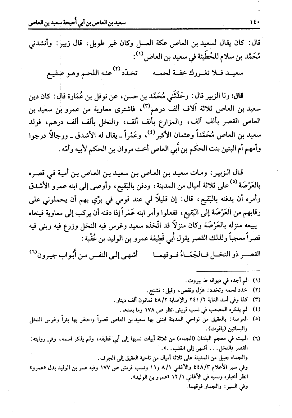 قال كان يقال لسعيد بن العاص عكة العسل وكان غير طويل قال زبير وأنشدني محمد بن سلام للحطيئة في سعيد بن العاص (1) سعيد فلا تغررك خفة لحمه * تخدد (2) عنه اللحم وهو صقيع * قال ونا الزبير قال وحدثني محمد بن حسن عن نوفل بن عمارة قال كان دين سعيد بن العاص ثلاثة آلاف ألف درهم (3) فاشترى معاوية من عمرو بن سعيد بن العاص القصر بألف ألف والمزارع بألف ألف والنخل بألف ألف درهم فولد سعيد بن العاص محمدا وعثمان الأكبر (4) وعمرا يقال له الأشدق ورجالا درجوا وأمهم أم البنين بنت الحكم بن أبي العاص أخت مروان بن الحكم لأبيه وأمه قال الزبير ومات سعيد بن العاص بن سعيد بن العاص بن أمية في قصره بالعرصة (5) على ثلاثة أميال من المدينة ودفن بالبقيع وأوصى إلى ابنه عمرو الأشدق وأمره أن يدفنه بالبقيع قال إن قليلا لي عند قومي في بري بهم أن يحملوني على رقابهم من العرصة إلى البقيع ففعلوا وأمر ابنه عمرا إذا دفنه أن يركب إلى معاوية فينعاه يبيعه منزله بالعرصة وكان منزلا قد اتخذه سعيد وغرس فيه النخل وزرع فيه وبنى فيه قصرا معجبا ولذلك القصر يقول أبي قطيفة عمرو بن الوليد بن عقبة القصر ذو النخل فالجماء فوقهما * أشهى إلى النفس من أبواب جيرون (6)