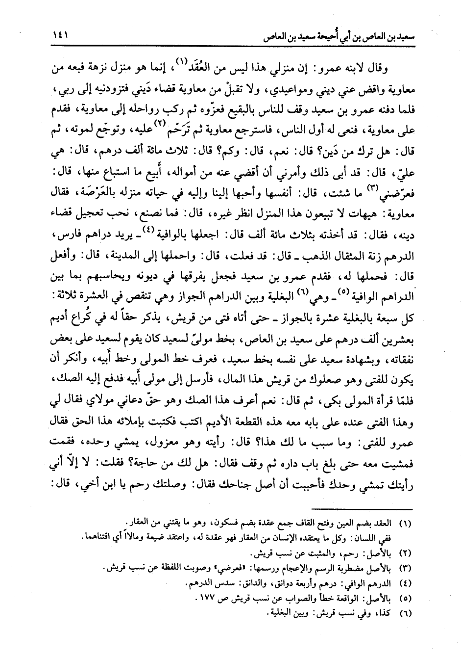 * وقال لابنه عمرو إن منزلي هذا ليس من العقد (1) إنما هو منزل نزهة فبعه من معاوية واقض عني ديني ومواعيدي ولا تقبل من معاوية قضاء ديني فتزودنيه إلى ربي فلما دفنه عمرو بن سعيد وقف للناس بالبقيع فعزوه ثم ركب رواحله إلى معاوية فقدم على معاوية فنعى له أول الناس فاسترجع معاوية ثم ترحم (2) عليه وتوجع لموته ثم قال هل ترك من دين قال نعم قال وكم قال ثلاث مائة ألف درهم قال هي علي قال قد أبى ذلك وأمرني أن أقضي عنه من أمواله أبيع ما استباع منها قال فعرضني (3) ما شئت قال أنفسها وأحبها إلينا وإليه في حياته منزله بالعرصة فقال معاوية هيهات لا تبيعون هذا المنزل انظر غيره قال فما نصنع نحب تعجيل قضاء دينه فقال قد أخذته بثلاث مائة ألف قال اجعلها بالوافيه (4) يريد دراهم فارس الدرهم زنة المثقال الذهب قال قد فعلت قال واحملها إلى المدينة قال وأفعل قال فحملها له فقدم عمرو بن سعيد فجعل يفرقها في ديونه ويحاسبهم بما بين الدراهم الوافية (5) وهي (6) البغلية وبين الدراهم الجواز وهي تنقص في العشرة ثلاثة كل سبعة بالبغلية عشرة بالجواز حتى أتاه فتى من قريش يذكر حقا له في كراع أديم بعشرين ألف درهم على سعيد بن العاص بخط مولى لسعيد كان يقوم لسعيد على بعض نفقاته وبشهادة سعيد على نفسه بخط سعيد فعرف خط المولى وخط أبيه وأنكر أن يكون للفتى وهو صعلوك من قريش هذا المال فأرسل إلى مولى أبيه فدفع إليه الصك فلما قرأة المولى بكى ثم قال نعم أعرف هذا الصك وهو حق دعاني مولاي فقال لي وهذا الفتى عنده على بابه معه هذه القطعة الأديم اكتب فكتبت بإملائه هذا الحق فقال عمرو للفتى وما سبب ما لك هذا قال رأيته وهو معزول يمشي وحده فقمت فمشيت معه حتى بلغ باب داره ثم وقف فقال هل لك من حاجة فقلت لا إلا أني رأيتك تمشي وحدك فأحببت أن أصل جناحك فقال وصلتك رحم يا ابن أخي قال