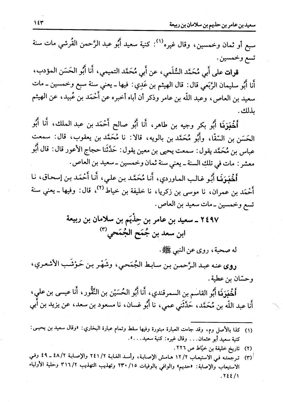 (3) ترجمته في الاستيعاب 2 / 12 هامش الاصابة وأسد الغابة 2 / 241 والاصابة 2 / 48 - 49 وفي الاستيعاب والاصابة: " حديم " والوافي بالوفيات 15 / 230 وتهذيب التهذيب 2 / 316 وحلية الاولياء 1 / 244
