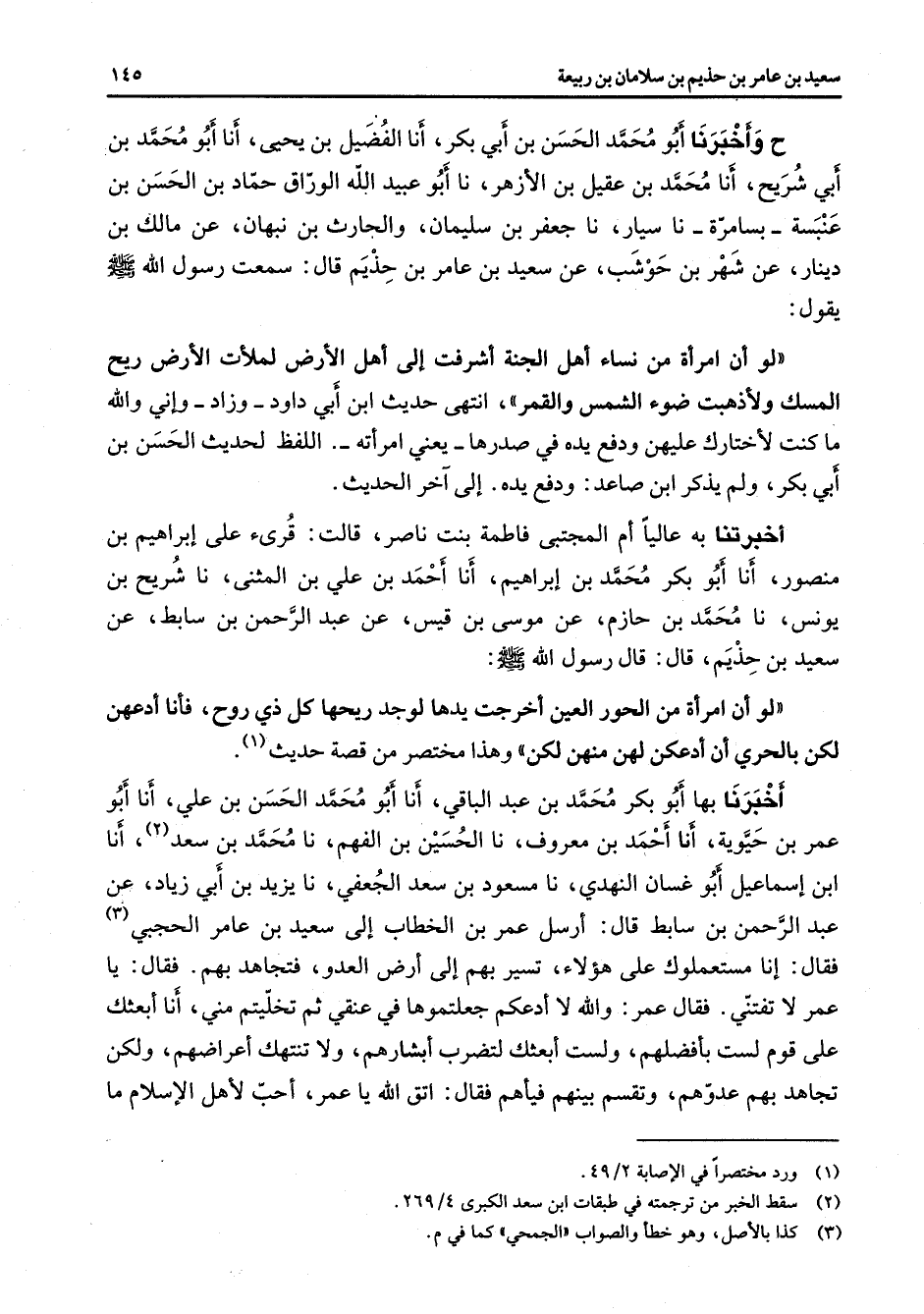 ح وأخبرنا أبو محمد الحسن بن أبي بكر أنا الفضيل بن يحيى أنا أبو محمد بن أبي شريح أنا محمد بن عقيل بن الأزهر نا أبو عبيد الله الوراق حماد بن الحسن بن عنبسة بسامرة نا سيار نا جعفر بن سليمان والحارث بن نبهان عن مالك بن دينار عن شهر بن حوشب عن سعيد بن عامر بن حذيم قال سمعت رسول الله (صلى الله عليه وسلم) يقول لو أن امرأة من نساء أهل الجنة أشرفت إلى أهل الأرض لملأت الأرض ريح المسك ولأذهبت ضوء الشمس والقمر انتهى حديث ابن أبي داود وزاد وإني والله ما كنت لأختارك عليهن ودفع يده في صدرها يعني امرأته اللفظ لحديث الحسن بن أبي بكر ولم يذكر ابن صاعد ودفع إلى آخر الحديث أخبرتنا به عاليا أم المجتبي فاطمة بنت ناصر قالت قرئ على إبراهيم بن منصور أنا أبو بكر محمد بن إبراهيم أنا أحمد بن علي بن المثنى نا شريح بن يونس نا محمد بن حازم عن موسى بن قيس عن عبد الرحمن بن سابط عن سعيد بن حذيم قال قال رسول الله (صلى الله عليه وسلم) لو أن امرأة من الحور العين أخرجت يدها لوجد ريحها كل ذي روح فأنا أدعهن لكن بالحري أن أدعكن لهن منهن لكن وهذا مختصر من قصة الحديث (1) أخبرنا بها أبو بكر محمد بن عبد الباقي أنا أبو محمد الحسن بن علي أنا أبو عمر بن حيوية أنا أحمد بن معروف نا الحسين بن الفهم نا محمد بن سعد (2) أنا ابن إسماعيل أبو غسان النهدي نا مسعود بن سعد الجعفي نا يزيد بن أبي زياد عن عبد الرحمن بن سابط قال أرسل عمر بن الخطاب إلى سعيد بن عامر الحجبي (3) فقال إنا مستعملوك على هؤلاء تسير بهم إلى أرض العدو فتجاهد بهم فقال يا عمر لا تفتني فقال عمر والله لا أدعكم جعلتموها في عنقي ثم تخليتم مني أنا أبعثك على قوم لست بأفضلهم ولست أبعثك لتضرب أبشارهم ولا تنتهك أعراضهم ولكن تجاهد بهم عدوهم وتقسم بينهم فيأهم فقال اتق الله يا عمر أحب لأهل الإسلام ما