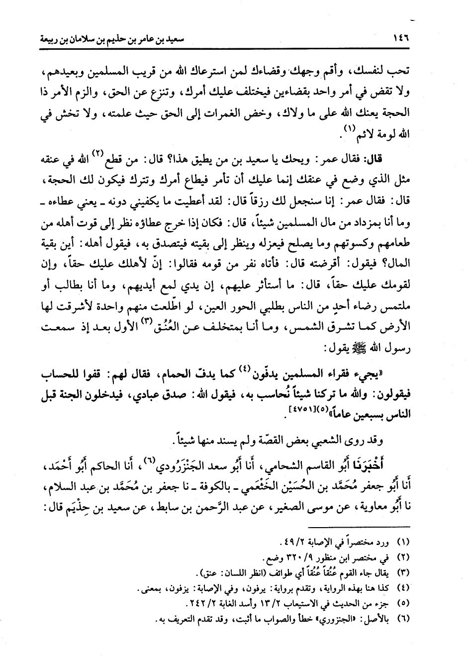 تحب لنفسك واقم وجهك وقضاءك لمن استرعاك الله من قريب المسلمين وبعيدهم ولا تقض في أمر واحد بقضاءين فيختلف عليك أمرك وتنزع عن الحق والزم الأمر ذا الحجة يعنك الله على ما ولاك وخض الغمرات إلى الحق حيث علمته ولا تخش في الله لومة لائم (1) قال فقال عمر ويحك يا سعيد بن من يطيق هذا قال من قطع (2) الله في عنقه مثل الذي وضع في عنقك إنما عليك أن تأمر فيطاع أمرك وتترك فيكون لك الحجة قال فقال عمر إنا سنجعل لك رزقا قال لقد أعطيت ما يكفيني دونه يعني عطاءه وما أنا بمزداد من مال المسلمين شيئا قال فكان إذا خرج عطاؤه نظر إلى قوت أهله من طعامهم وكسوتهم وما يصلح فيعزله وينظر إلى بقيته فيتصدق به فيقول أهله أين بقية المال فيقول أقرضته قال فأتاه نفر من قومه فقالوا إن لأهلك عليك حقا وإن لقومك عليك حقا قال ما استأثر عليهم إن يدي لمع أيديهم وما أنا بطالب أو ملتمس رضاء أحد من الناس بطلبي الحور العين لو اطلعت منهم واحدة لأشرقت لها الأرض كما تشرق الشمس وما أنا بمتخلف عن العنق (3) الأول بعد إذ سمعت رسول الله (صلى الله عليه وسلم) يقول يجئ فقراء المسلمين يدفون (4) كما يدف الحمام فقال لهم قفوا للحساب فيقولون والله ما تركنا شيئا نحاسب به فيقول الله صدق عبادي فيدخلون الجنة قبل الناس بسبعين عاما (5) وقد روى الشعبي بعض القصة ولم يسند منها شيئا أخبرنا أبو القاسم الشحامي أنا أبو سعد الجنزرودي (6) أنا الحاكم أبو أحمد أنا أبو جعفر محمد بن الحسين الخثعمي بالكوفة نا جعفر بن محمد بن عبد السلام نا أبو معاوية عن موسى الصغير عن عبد الرحمن بن سابط عن سعيد بن حذيم قال