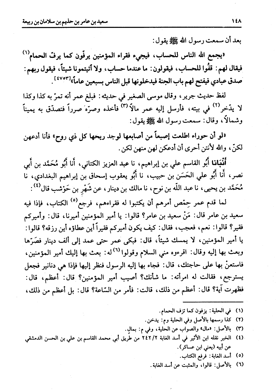 بعد أن سمعت رسول الله (صلى الله عليه وسلم) يقول يجمع الله الناس للحساب فيجئ فقراء المؤمنين يرفون كما يرف الحمام (1) فيقال لهم قفوا للحساب فيقولون ما عندنا حساب ولا آتيتمونا شيئا فيقول ربهم صدق عبادي فيفتح لهم باب الجنة فيدخلونها قبل الناس بسبعين عاما لفظ حديث جرير وقال موسى الصغير في حديثه فبلغ عمر أنه تمر به كذا وكذا لا يدخر (2) في بيته فأرسل إليه عمر مالا فأخذه وصره صررا فتصدق به يمينا وشمالا وقال سمعت رسول الله (صلى الله عليه وسلم) يقول لو أن حوراء اطلعت إصبعا من أصابعها لوجد ريحها كل ذي روح فأنا أدعهن لكن والله لأنتن أحرى أن أدعكن لهن منهن لكن أنبأنا أبو القاسم علي بن إبراهيم نا عبد العزيز الكتاني أنا أبو محمد بن أبي نصر أنا أبو علي الحسن بن حبيب نا أبو يعقوب إسحاق بن إبراهيم البغدادي نا محمد بن يحيى نا عبد الله بن نوح نا مالك بن دينار عن شهر بن حوشب قال (4) لما قدم عمر حمص أمرهم أن يكتبوا له فقراءهم فرجع (5) الكتاب فإذا فيه سعيد بن عامر قال من سعيد بن عامر قالوا يا أمير المؤمنين أميرنا قال وأميركم فقير قالوا نعم فعجب فقال كيف يكون أميركم فقيرا أين عطاؤه أين رزقه قالوا: يا أمير المؤمنين لا يمسك شيئا قال فبكى عمر حتى عمد إلى ألف دينار فصرها وبعث بها إليه وقال اقرءوه مني السلام وقولوا (6) له بعث بها إليك أمير المؤمنين فاستعن بها على حاجتك قال فجاء بها إليه الرسول فنظر إليها فإذا هي دنانير فجعل يسترجع فقال له امرأته ما شأنك أصيب أمير المؤمنين قال أعظم قال فظهرت آية قال أعظم من ذلك قالت فأمر من الساعة قال بل أعظم من ذلك