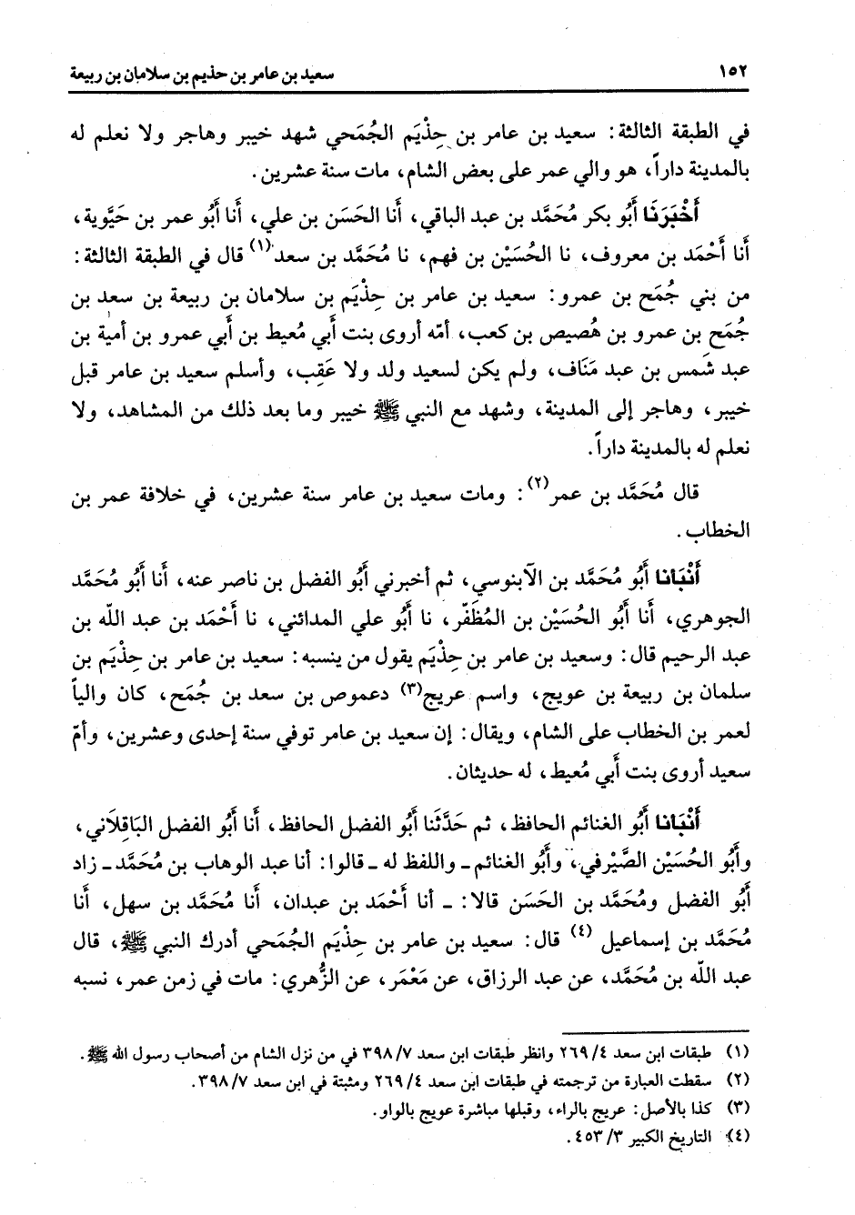 (1) طبقات ابن سعد 4 / 269 وانظر طبقات ابن سعد 7 / 398 في من نزل الشام من أصحاب رسول الله صلى الله عليه وآله وسلم