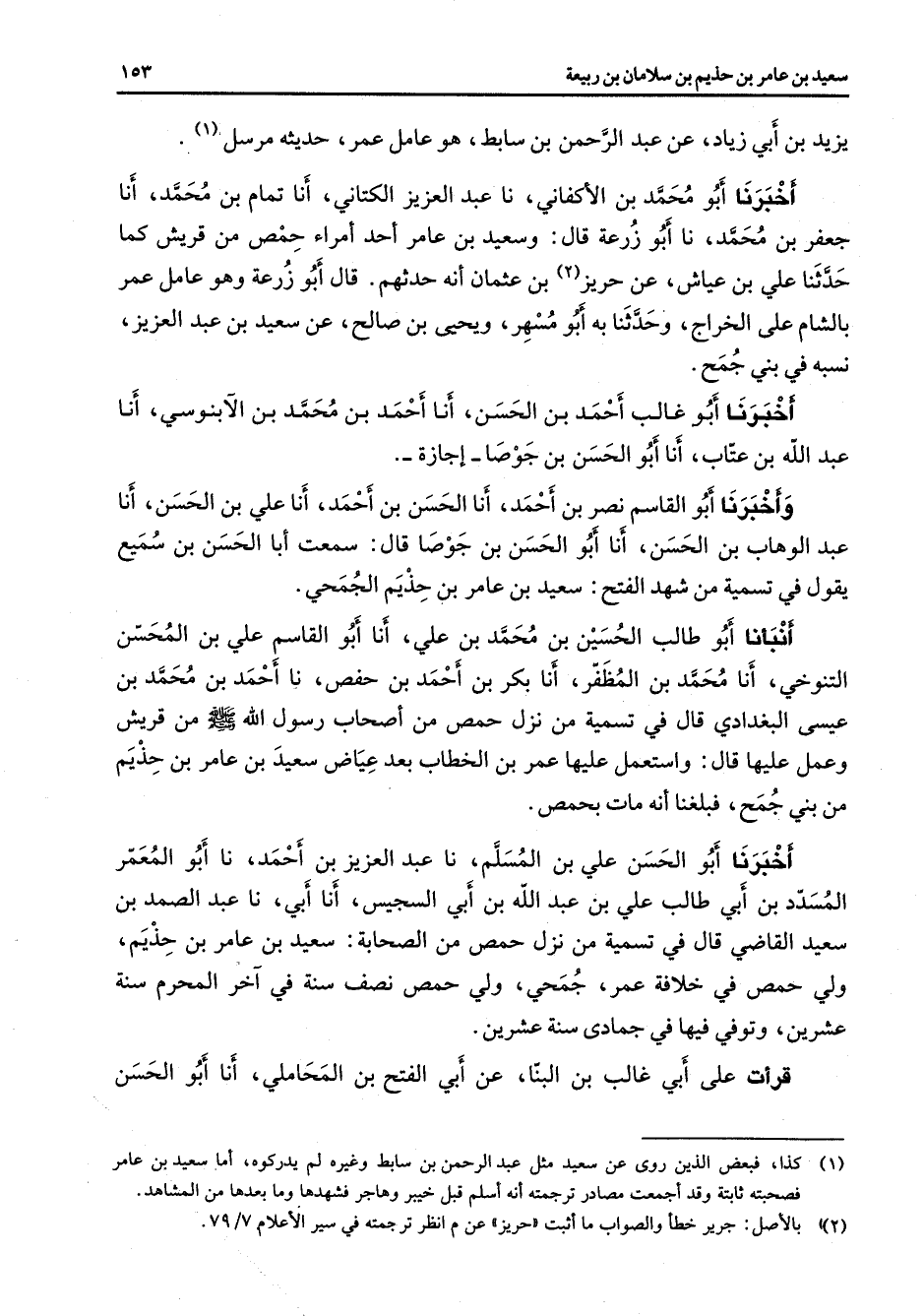 (1) كذا فبعض الذين روى عن سعيد مثل عبد الرحمن بن سابط وغيره لم يدركوه أما سعيد بن عامر فصحبته ثابتة وقد أجمعت مصادر ترجمته أنه أسلم قبل خيبر وهاجر فشهدها وما بعدها من المشاهد