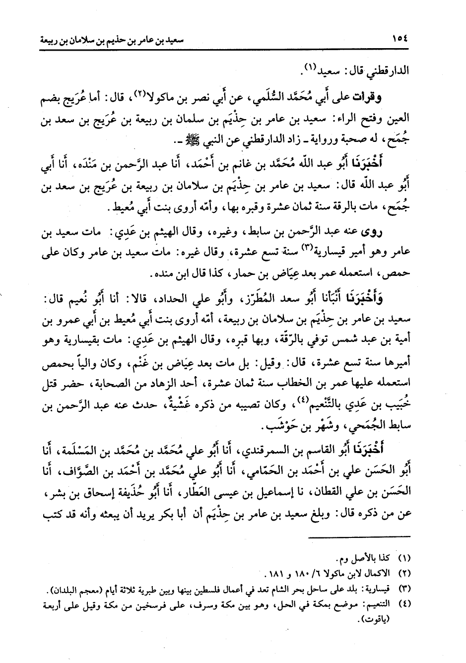 الدارقطني قال سعيد (1) وقرأت على أبي محمد السلمي عن أبي نصر بن ماكولا (2) قال أما عريج بضم العين وفتح الراء سعيد بن عامر بن حذيم بن سلمان بن ربيعة بن عريح بن سعد بن جمح له صحبة ورواية زاد الدارقطني عن النبي (صلى الله عليه وسلم) أخبرنا أبو عبد الله محمد بن غانم بن أحمد أنا عبد الرحمن بن منده أنا أبي أبو عبد الله قال سعيد بن عامر بن حذيم بن سلامان بن ربيعة بن عريج بن سعد بن جمح مات بالرقة سنة ثمان عشرة وقبره بها وأمه أروى بنت أبي معيط روى عنه عبد الرحمن بن سابط وغيره وقال الهيثم بن عدي مات سعيد بن عامر وهو أمير قيسارية (3) سنة تسع عشرة وقال غيره مات سعيد بن عامر وكان على حمص استعمله عمر بعد عياض بن حمار كذا قال ابن منده وأخبرنا أنبأنا أبو سعد المطرز وأبو علي الحداد قالا أنا أبو نعيم قال سعيد بن عامر بن حذيم بن سلامان بن ربيعة أمه أروى بنت أبي معيط بن أبي عمرو بن أمية بن عبد شمس توفي بالرقة وبها قبره وقال الهيثم بن عدي مات بقيسارية وهو أميرها سنة تسع عشرة قال وقيل بل مات بعد عياض بن غنم وكان واليا بحمص استعمله عليها عمر بن الخطاب سنة ثمان عشرة أحد الزهاد من الصحابة حضر قتل خبيب بن عدي بالتنعيم (4) وكان تصيبه من ذكره غشية حدث عنه عبد الرحمن بن سابط الجمحي وشهر بن حوشب أخبرنا أبو القاسم بن السمرقندي أنا أبو علي محمد بن محمد بن المسلمة أنا أبو الحسن علي بن أحمد بن الحمامي أنا أبو علي محمد بن أحمد بن الصواف أنا الحسن بن علي القطان نا إسماعيل بن عيسى العطار أنا أبو حذيفة إسحاق بن بشر عن من ذكره قال وبلغ سعيد بن عامر بن حذيم أن أبا بكر يريد أن يبعثه وأنه قد كتب