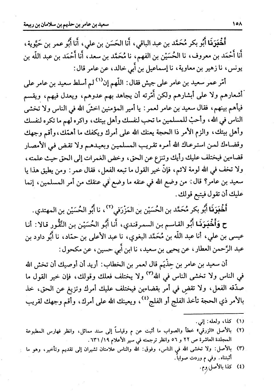 أخبرنا أبو بكر محمد بن عبد الباقي أنا الحسن بن علي أنا أبو عمر بن حيوية أنا أحمد بن معروف نا الحسين بن الفهم نا محمد بن سعد أنا أحمد بن عبد الله بن يونس نا زهير بن معاوية نا إسماعيل بن أبي خالد عن عامر قال أمر عمر سعيد بن عامر على جيش فقال اللهم إن (1) لم أسلط سعيد بن عامر على أشعارهم ولا على أبشارهم ولكن أمرته أن يجاهد بهم عدوهم ويعدل فيهم ويقسم فيأهم بينهم فقال سعيد بن عامر لعمر يا أمير المؤمنين اخش الله في الناس ولا تخشى الناس في الله وأحب للمسلمين ما تحب لنفسك وأهل بيتك وأكره لهم ما تكره لنفسك وأهل بيتك والزم الأمر ذا الحجة يعنك الله على أمرك ويكفك ما أهمك وأقم وجهك وقضاءك لمن استرعاك الله أمره تقريب المسلمين وبعيدهم ولا تقض في الأمصار قضاءين فيختلف عليك رأيك وتنزع عن الحق وخض الغمرات إلى الحق حيث علمته ولا تخف في الله لومة لائم فإن خير القول ما تبعه الفعل فقال عمر ومن يطيق هذا يا سعيد بن عامر قال من وضع الله في عنقه ما وضع في عنقك من أمر المسلمين إنما عليك أن تقول فيتبع قولك أخبرنا أبو بكر محمد بن الحسين بن المزرفي (2) نا أبو الحسين بن المهتدي ح وأخبرنا أبو القاسم بن السمرقندي أنا أبو الحسين بن النقور قالا أنا عيسى بن علي أنا عبد الله بن محمد البغوي نا عبد الأعلى بن حماد نا أبو داود بن عبد الرحمن العطار عن يحيى بن سعيد نا ابن أبي حسين عن مكحول أن سعيد بن عامر بن حذيم قال لعمر بن الخطاب أريد أن أوصيك أن تخش الله في الناس ولا تخشى الناس في الله (3) ولا يختلف فعلك وقولك فإن خير القول ما صدقه الفعل ولا تقض في أمر بقضاءين فيختلف عليك أمرك وتزيغ عن الحق خذ بالأمر ذي الحجة تأخذ الفلج أو الفلج (4) ويعينك الله على أمرك وأقم وجهك لقريب