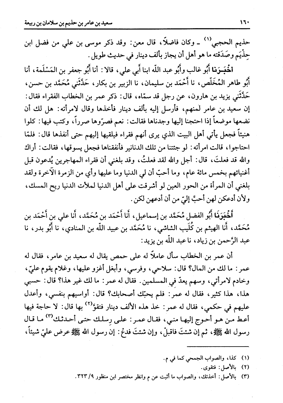 حذيم الحجبي (1) وكان فاضلا قال معن وقد ذكر موسى بن علي من فضل ابن حذيم وصدقته ما هو أهل أن يجاز بألف دينار في حديث طويل أخبرنا أبو غالب وأبو عبد الله ابنا أبي علي قالا أنا أبو جعفر بن المسلمة أنا أبو طاهر المخلص نا أحمد بن سليمان نا الزبير بن بكار حدثني محمد بن حسن حدثني يزيد بن هارون عن رجل قد سماه قال ذكر عمر بن الخطاب الفقراء فقال إن سعيد بن عامر لمنهم فأرسل إليه بألف دينار فأخذها وقال لامرأته هل لك أن نضعها موضعا إذا احتجنا إليها وجدناها فقالت نعم فصروها صررا وكتب فيها كلوا هنيئا فجعل يأتي أهل البيت الذي يرى أنهم فقراء فيلقيها إليهم حتى أنفذها قال فلما احتاجوا قالت امرأته لو جئتنا من تلك الدنانير فأنفقناها فجعل يسوقها فقالت أراك والله قد فعلت قال أجل والله لقد فعلت وقد بلغني أن فقراء المهاجرين يدعون قبل أغنيائهم بخمس مائة عام وما أحب أن لي الدنيا وما عليها وأي من الزمرة الآخرة ولقد بلغني أن المرأة من الحور العين لو أشرقت على أهل الدنيا لملأت الدنيا ريح المسك ولأن أدعكن لهن أحب إلي من أن أدعهن لكن أخبرنا أبو الفضل محمد بن إسماعيل أنا أحمد بن محمد أنا علي بن أحمد بن محمد أنا الهثيم بن كليب الشاشي نا محمد بن عبيد الله بن المنادي نا أبو بدر نا عبد الرحمن بن زياد نا عبد الله بن يزيد أن عمر بن الخطاب سأل عاملا له على حمص يقال له سعيد بن عامر فقال له عمر ما لك من المال قال سلاحي وفرسي وأبغل أغزو عليها وغلام يقوم علي وخادم لامرأتي وسهم يعد في المسلمين فقال له عمر ما لك غير هذا قال حسبي هذا هذا كثير فقال له عمر فلم يحبك أصحابك قال أواسيهم بنفسي وأعدل عليهم في حكمي فقال له عمر خذ هذه الألف دينار فتقو (2) بها قال لا حاجة فيها أعط من هو أحوج إليها مني فقال عمر على رسلك حتى أحدثك (3) ما قال رسول الله (صلى الله عليه وسلم) ثم إن شئت فاقبل وإن شئت فدع إن رسول الله (صلى الله عليه وسلم) عرض علي شيئا