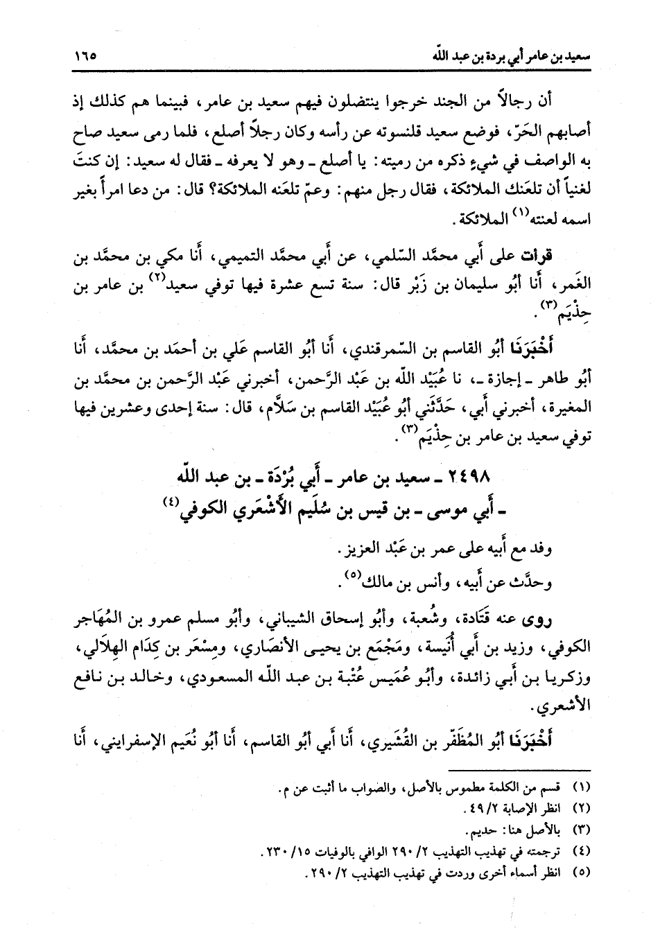 2498 - سعيد بن عامر أبي بردة بن عبد الله أبي موسى بن قيس بن سليم الأشعري الكوفي (4) وفد مع أبيه على عمر بن عبد العزيز وحدث عن أبيه وأنس بن مالك (5) روى عنه قتادة وشعبة وأبو إسحاق الشيباني وأبو مسلم عمرو بن المهاجر الكوفي وزيد بن أبي أنيسة ومجمع بن يحيى الأنصاري ومسعر بن كدام الهلالي وزكريا بن أبي زائدة وأبو عميس عتبة بن عبد الله المسعودي وخالد بن نافع الأشعري أخبرنا أبو المظفر بن القشيري أنا أبي أبو القاسم أنا أبو نعيم الإسفرايني أنا