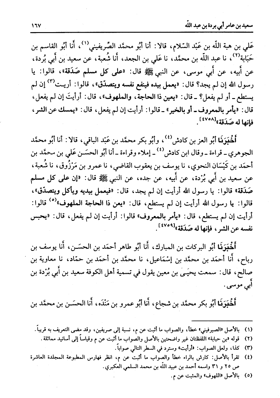 علي بن هبة الله بن عبد السلام قالا أنا أبو محمد الصريفيني (1) أنا أبو القاسم بن حبابة (2) نا عبد الله بن محمد نا علي بن الجعد أنا شعبة عن سعيد بن أبي بردة عن أبيه عن أبي موسى عن النبي (صلى الله عليه وسلم) قال على كل مسلم صدقة قالوا يا رسول الله إن لم يجد قال يعمل بيده فينفع نفسه ويتصدق قالوا أريت (3) إن لم يستطع أو لم يفعل قال يعين ذا الحاجة والملهوف قال أرأيت إن لم يفعل قال يأمر بالمعروف أو بالخير قالوا أرأيت إن لم يفعل قال يمسك عن الشر فإنها له صدقة أخبرنا أبو العز بن كادش (4) وأبو بكر محمد بن عبد الباقي قالا أنا أبو محمد الجوهري قراءة وقال ابن كادش (4) إملاء وقراءة أنا أبو الحسن علي بن محمد بن أحمد بن كيسان النحوي نا يوسف بن يعقوب القاضي نا عمرو بن مرزوق نا شعبة عن سعيد بن أبي بردة عن أبيه عن جده عن النبي (صلى الله عليه وسلم) قال إن على كل مسلم صدقة قالوا يا رسول الله أرأيت إن لم يجد قال فيعمل بيديه ويأكل ويتصدق قالوا يا رسول الله إن لم يستطع قال يعن ذا الحاجة الملهوف (5) قالوا أرأيت إن لم يستطع قال يأمر بالمعروف قالوا أرأيت إن لم يفعل قال يحبس نفسه عن الشر فإنها له صدقه أخبرنا أبو البركات بن المبارك أنا أبو طاهر أحمد بن الحسن أنا يوسف بن رباح أنا أحمد بن محمد بن إسماعيل نا محمد بن أحمد بن حماد نا معاوية بن صالح قال سمعت يحيى بن معين يقول في تسمية أهل الكوفة سعيد بن أبي بردة بن أبي موسى أخبرنا أبو بكر محمد بن شجاع أنا أبو عمرو بن منده أنا الحسن بن محمد بن