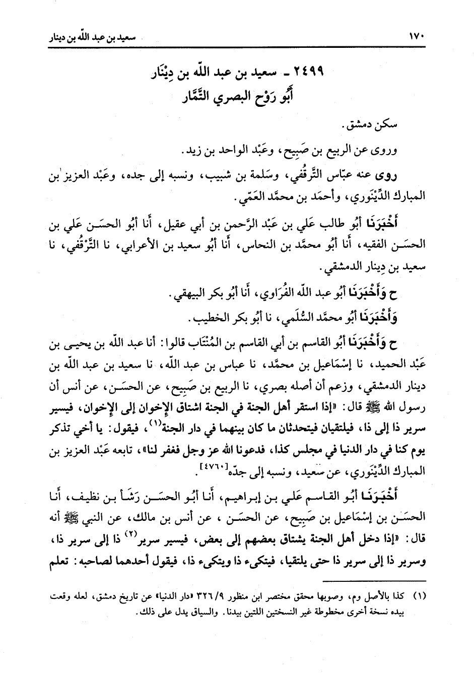 2499 - سعيد بن عبد الله بن دينار أبو روح البصري التمار سكن دمشق وروى عن الربيع بن صبيح وعبد الواحد بن زيد روى عنه عباس الترقفي وسلمة بن شبيب ونسبه إلى جده وعبد العزيز بن المبارك الدينوري وأحمد بن محمد العمي أخبرنا أبو طالب علي بن عبد الرحمن بن أبي عقيل أنا أبو الحسن علي بن الحسن الفقيه أنا أبو محمد بن النحاس أنا أبو سعيد بن الأعرابي نا الترقفي نا سعيد بن دينار الدمشقي ح وأخبرنا أبو عبد الله الفراوي أنا أبو بكر البيهقي وأخبرنا أبو محمد السلمي نا أبو بكر الخطيب ح وأخبرنا أبو القاسم بن أبي القاسم بن المنتاب قالوا أنا عبد الله بن يحيى بن عبد الحميد نا إسماعيل بن محمد نا عباس بن عبد الله نا سعيد بن عبد الله بن دينار الدمشقي وزعم أن أصله بصري نا الربيع بن صبيح عن الحسن عن أنس أن رسول الله (صلى الله عليه وسلم) قال إذا استقر أهل الجنة في الجنة اشتاق الإخوان إلى الإخوان فيسير سرير ذا إلى ذا فيلتقيان فيتحدثان ما كان بينهما في دار الجنة (1) فيقول يا أخي تذكر يوم كنا في دار الدنيا في مجلس كذا فدعونا الله عز وجل فغفر لنا تابعه عبد العزيز بن المبارك الدنيوري عن سعيد ونسبه إلى جده أخبرنا أبو القاسم علي بن إبراهيم أنا أبو الحسن رشأ بن نظيف أنا الحسن بن إسماعيل بن صبيح عن الحسن عن أنس بن مالك عن النبي (صلى الله عليه وسلم) أنه قال إذا دخل أهل الجنة يشتاق بعضهم إلى بعض فيسير سرير ذا إلى سرير ذا وسرير (2) ذا إلى سرير ذا حتى يلتقيا فيتكئ ذا ويتكئ ذا فيقول أحدهما لصحابه تعلم