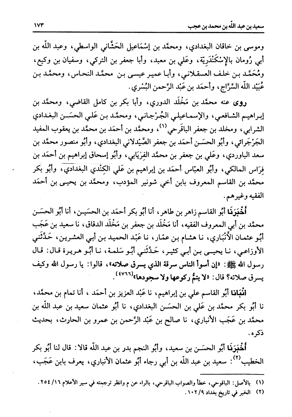 وموسى بن خاقان البغدادي ومحمد بن إسماعيل الحشاني والواسطي وعبد الله بن أبي رومان بالإسكندرية وعلي بن معبد وأبا جعفر بن التركي وسفيان بن وكيع ومحمد بن خلف العسقلاني وأبا عمير عيسى بن محمد النحاس ومحمد بن عبيد الله السراج وأحمد بن عبد الرحمن البسري روى عنه محمد بن مخلد الدوري وأبا بكر بن كامل القاضي ومحمد بن إبراهيم الشافعي والإسماعيلي الجرجاني ومحمد بن علي الحسن البغدادي الشرابي ومخلد بن جعفر الباقرحي (1) ومحمد بن أحمد بن محمد بن يعقوب المفيد الجرجرائي وأبو الحسن أحمد بن جعفر الصيدلاني البغدادي وأبو منصور محمد بن سعد الباوردي وعلي بن جعفر بن محمد الفريابي وأبو إسحاق إبراهيم بن أحمد بن فراس المالكي وأبو العباس أحمد بن إبراهيم بن علي الكندي البغدادي وأبو بكر محمد بن القاسم المعروف بابن أخي شونير المؤدب ومحمد بن يحيى بن أحمد الفقيه وغيرهم أخبرنا أبو القاسم زاهر بن طاهر أنا أبو بكر أحمد بن الحسين أنا أبو الحسن محمد بن أبي المعروف الفقيه أنا مخلد بن جعفر بن مخلد الدقاق نا سعيد بن عجب أبو عثمان الأنباري نا هشام بن عمار نا عبد الحميد بن أبي العشرين حدثني الأوزاعي نا يحيى بن أبي كثير حدثني أبو سلمة نا أبو هريرة قال قال رسول الله (صلى الله عليه وسلم) إن أسوأ الناس سرقة الذي يسرق صلاته قالوا يا رسول الله وكيف يسرق صلاته قال لا يتم ركوعها ولا سجودها أنبأنا أبو القاسم علي بن إبراهيم نا عبد العزيز بن أحمد أنا تمام بن محمد نا أبو بكر محمد بن علي بن الحسن البغدادي نا أبو عثمان سعيد بن عبد الله بن محمد بن عجب الأنباري نا صالح بن عبد الرحمن بن عمرو بن الحارث بحديث ذكره أخبرنا أبو الحسن بن سعيد وأبو النجم بدر بن عبد الله قالا قال لنا أبو بكر الخطيب (2) سعيد بن عبد الله بن أبي رجاء أبو عثمان الأنباري يعرف بابن عجب