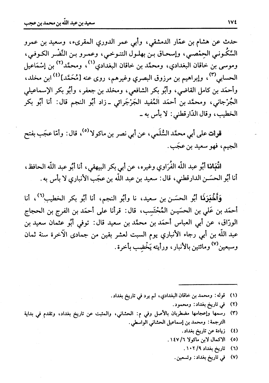 حدث عن هشام بن عمار الدمشقي وأبي عمر الدوري المقرئ وسعيد بن عمرو السكوني الحمصي وإسحاق بن بهلول التنوخي وعمرو بن النضر الكوفي وموسى بن خاقان البغدادي ومحمد بن خاقان البغدادي (1) ومحمد (2) بن إسماعيل الحسابي (3) وإبراهيم بن مرزوق البصري وغيرهم روى عنه محمد (4) ابن مخلد وأحمد بن كامل القاضي وأبو بكر الشافعي ومخلد بن جعفر وأبو بكر الإسماعيل الجرجاني ومحمد بن أحمد المفيد الجرجرائي زاد أبو النجم قال أنا أبو بكر الخطيب وقال الدارقطني لا بأس به قرأت على أبي محمد السلمي عن أبي نصر بن ماكولا (5) قال وأما عجب بفتح الجيم فهو سعيد بن عجب أنبأنا أبو عبد الله الفراوي وغيره عن أبي بكر البيهقي أنا أبو عبد الله الحافظ أنا أبو الحسن الدارقطني قال سعيد بن عبد الله بن عجب الأنباري لا بأس به وأخبرنا أبو الحسن بن سعيد نا وأبو النجم أنا أبو بكر الخطيب (6) أنا أحمد بن علي بن الحسين المحتسب قال قرأنا على أحمد بن الفرج بن الحجاج الوراق عن أبي العباس أحمد بن محمد بن سعيد قال توفي أبو عثمان سعيد بن عبد الله بن أبي رجاء الأنباري يوم السبت لعشر بقين من جمادي الآخر سنة ثمان وسبعين (7) ومائتين بالأنبار ورأيته يخضب بأخرة