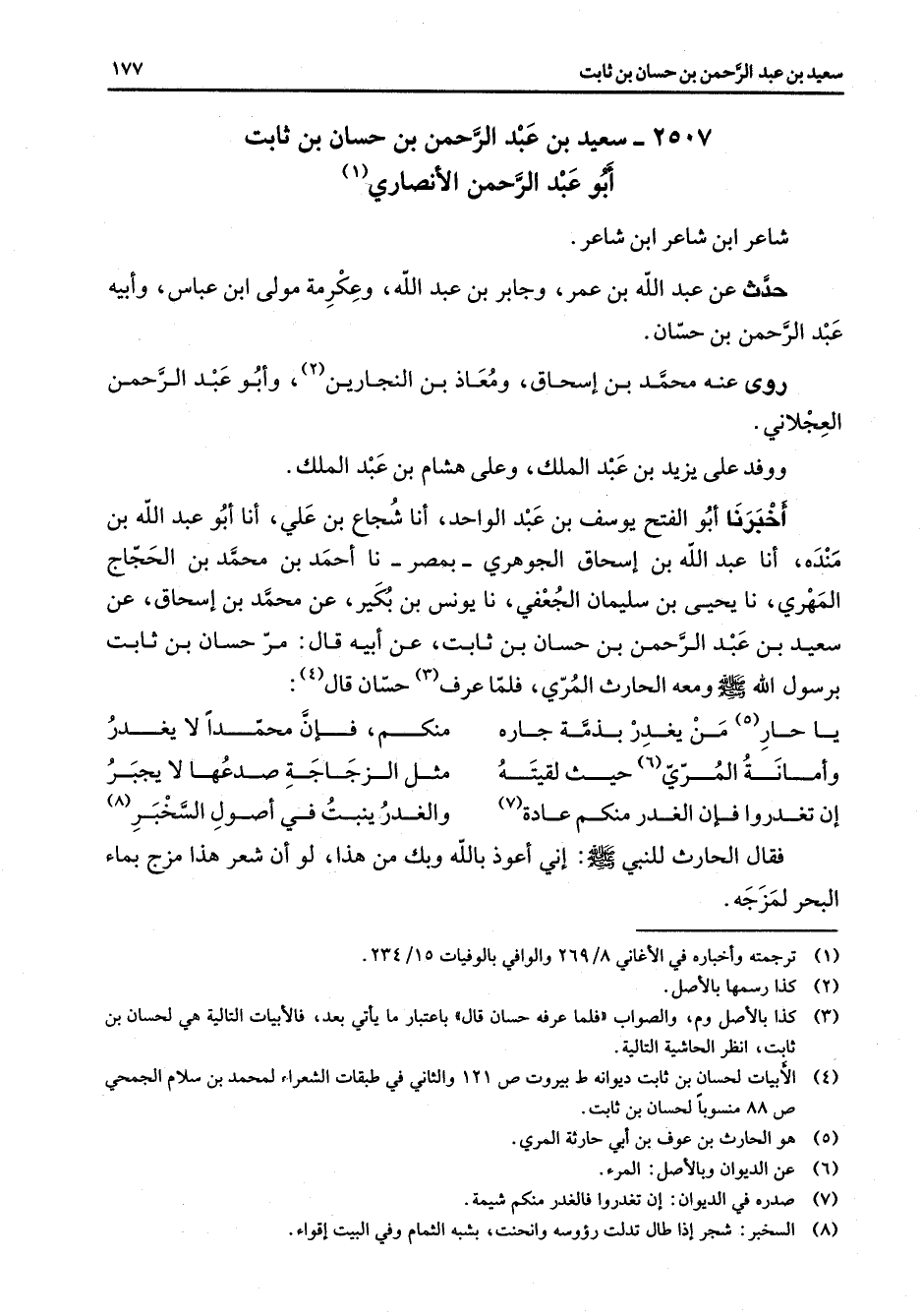 2507 - سعيد بن عبد الرحمن بن حسان بن ثابت أبو عبد الرحمن الأنصاري (1) شاعر ابن شاعر ابن شاعر حدث عن عبد الله بن عمر وجابر بن عبد الله وعكرمة مولى ابن عباس وأبيه عبد الرحمن بن حسان روى عنه محمد بن إسحاق ومعاذ بن النجارين (2) وأبو عبد الرحمن العجلاني ووفد على يزيد بن عبد الملك وعلى هشام بن عبد الملك أخبرنا أبو الفتح يوسف بن عبد الواحد أنا شجاع بن علي أنا أبو عبد الله بن منده أنا عبد الله بن إسحاق الجوهري بمصر نا أحمد بن محمد بن الحجاج المهري نا يحيى بن سليمان الجعفي نا يونس بن بكير عن محمد بن إسحاق عن سعيد بن عبد الرحمن بن حسان بن ثابت عن أبيه قال مر حسان بن ثابت برسول الله (صلى الله عليه وسلم) ومعه الحارث المري فلما عرف (3) حسان قال (4) * يا حار (5) من يغدر بذمة جاره * منكم فإن محمدا لا يغدر وأمانة المري (6) حيث لقيته * مثل الزجاجة صدعها لا يجبر إن تغدروا فإن الغدر منكم عادة (7) * والغدر ينبت في أصول السخبر (8) * فقال الحارث للنبي (صلى الله عليه وسلم) إني أعوذ بالله وبك من هذا لو أن شعر هذا مزج بماء البحر لمزجه