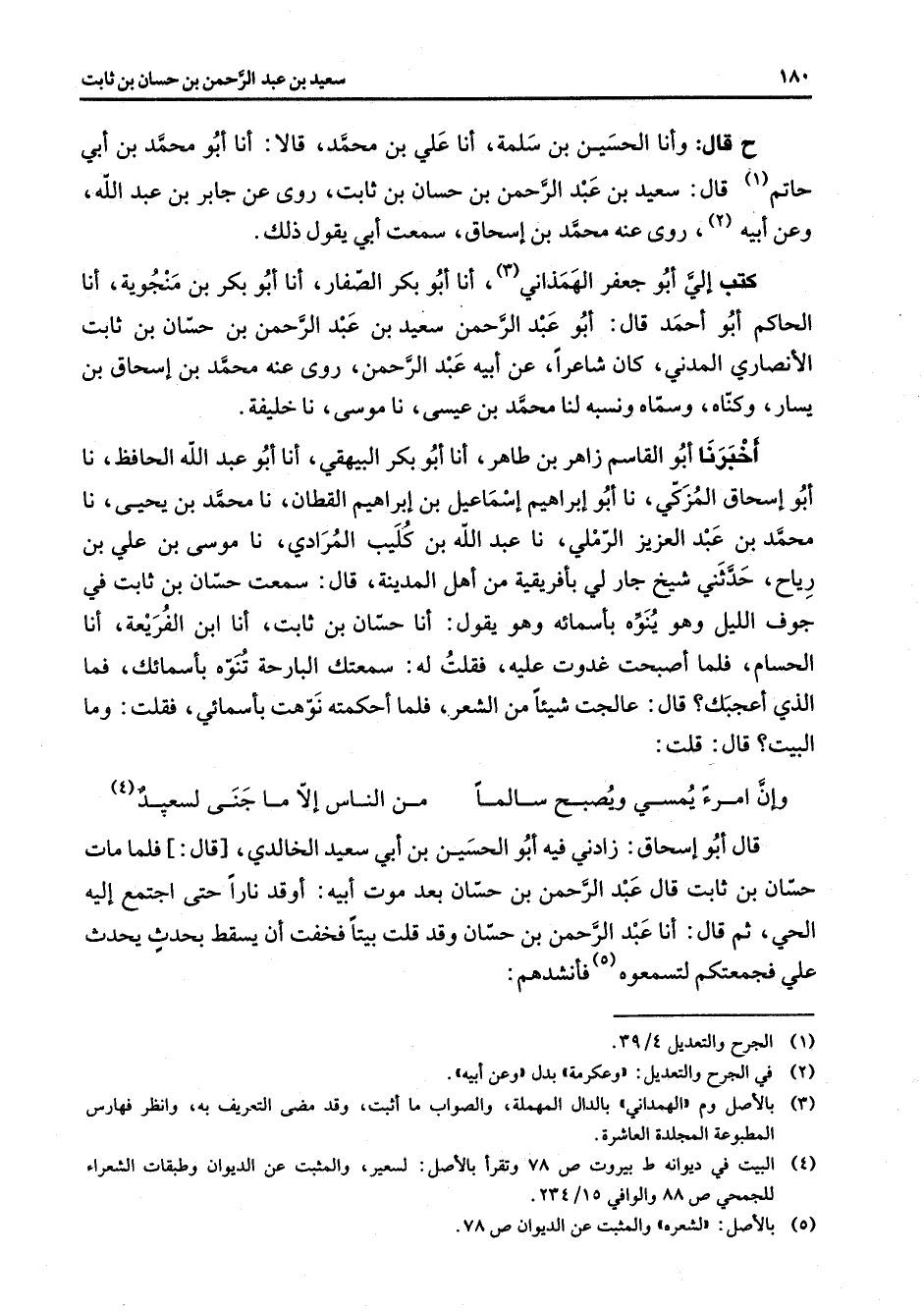 ح قال وأنا الحسين بن سلمة أنا علي بن محمد قالا أنا أبو محمد بن أبي حاتم (1) قال سعيد بن عبد الرحمن بن حسان بن ثابت روى عن جابر بن عبد الله وعن أبيه (2) روى عنه محمد بن إسحاق سمعت أبي يقول ذلك كتب إلي أبو جعفر الهمذاني (3) أنا أبو بكر الصفار أنا أبو بكر بن منجوية أنا الحاكم أبو أحمد قال أبو عبد الرحمن سعيد بن عبد الرحمن بن حسان بن ثابت الأنصاري المدني كان شاعرا عن أبيه عبد الرحمن روى عنه محمد بن إسحاق بن يسار وكناه وسماه ونسبه لنا محمد بن عيسى نا موسى نا خليفة أخبرنا أبو القاسم زاهر بن طاهر أنا أبو بكر البيهقي أنا أبو عبد الله الحافظ نا أبو إسحاق المزكي نا أبو إبراهيم إسماعيل بن إبراهيم القطان نا محمد بن يحيى نا محمد بن عبد العزيز الرملي نا عبد الله بن كليب المرادي نا موسى بن علي بن رياح حدثني شيخ جار لي بأفريقية من أهل المدينة قال سمعت حسان بن ثابت في جوف الليل وهو ينوه بأسمائه وهو يقول أنا حسان بن ثابت أنا ابن الفريعة أنا الحسام فلما أصبحت غدوت عليه فقلت له سمعتك البارحة تنوه بأسمائك فما الذي أعجبك قال عالجت شيئا من الشعر فلما أحكمته نوهت بأسمائي فقلت وما البيت قال قلت وإن امرء يمسي ويصبح سالما * من الناس إلا ما جنى لسعيد (4) قال أبو إسحاق زادني فيه أبو الحسين بن أبي سعيد الخالدي قال فلما مات حسان بن ثابت قال عبد الرحمن بن حسان بعد موت أبيه أوقد نارا حتى اجتمع إليه الحي ثم قال أنا عبد الرحمن بن حسان وقد قلت بيتا فخفت أن يسقط بحدث يحدث علي فجمعتكم لتسمعوه (5) فأنشدهم