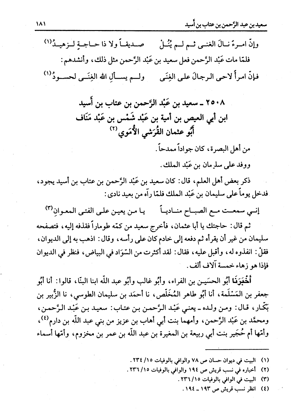 2508 - سعيد بن عبد الرحمن بن عتاب بن أسيد ابن أبي العيص بن أمية بن عبد شمس بن عبد مناف أبو عثمان القرشي الأموي (2) من أهل البصرة كان جوادا ممدحا ووفد على سليمان بن عبد الملك ذكر بعض أهل العلم قال كان سعيد بن عبد الرحمن بن عتاب بن أسيد يجود فدخل يوما على سليمان بن عبد الملك فلما رآه من بعيد نادى إني سمعت مع الصباح مناديا * يا من يعين على الفتى المعوان (3) * ثم قال حاجتك يا أبا عثمان فأخرج سعيد من كمه طومارا فقذفه إليه فتصفحه سليمان من غير أن يقرأه ثم دفعه إلى خادم كان على رأسه وقال اذهب به إلى الديوان فقل انفذوه له وأقبل عليه فقال لقد أكثرت من السواد في البياض فنظر في الديوان فإذا هو زهاء خمسة آلاف ألف أخبرنا أبو الحسين بن الفراء وأبو غالب وأبو عبد الله ابنا البنا قالوا أنا أبو جعفر بن المسلمة أنا أبو طاهر المخلص نا أحمد بن سليمان الطوسي نا الزبير بن بكار قال ومن ولده يعني عبد الرحمن بن عتاب سعيد بن عبد الرحمن ومحمد بن عبد الرحمن وأمهما بنت أبي أهاب بن عزيز من بني عبد الله بن دارم (4) وأمها أم حجير بنت أبي ربيعة بن المغيرة بن عبد الله بن عمر بن مخزوم وأمها أسماء