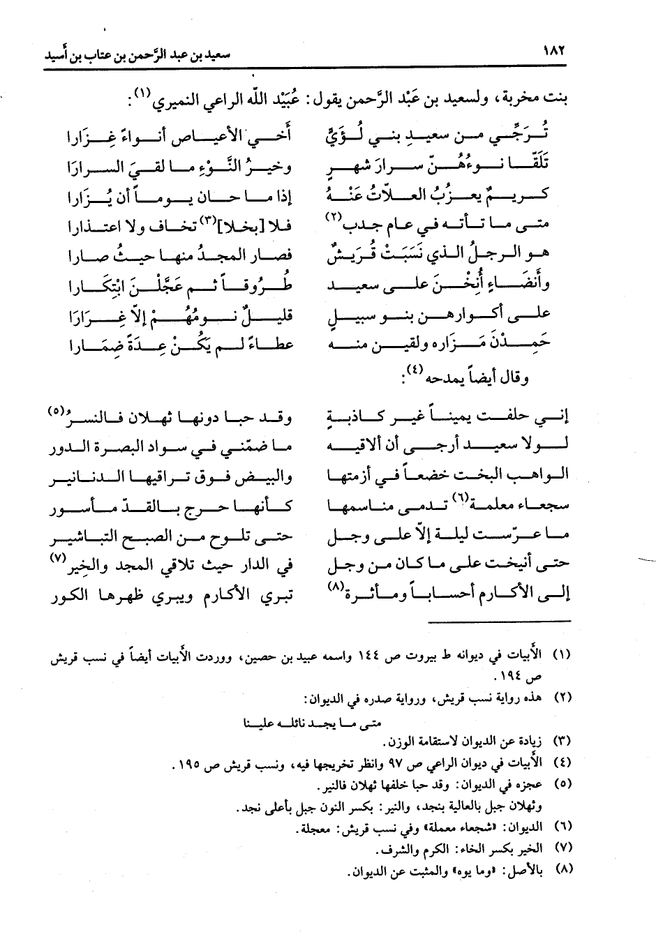بنت مخربة ولسعيد بن عبد الرحمن يقول عبيد الله الراعي النميري (1) ترجي من سعيد بني لؤي * أخي الأعياص أنواء غزارا تلقا نوءهن سرار شهر * وخير النوء ما لقي السرارا كريم يعزب العلات عنه * إذا ما حان يوما أن يزارا متى ما تأته في عام جدب (2) * فلا بخلا (3) تخاف ولااعتذارا هو الرجل الذي نسبت قريش * فصار المجد منها حيث صارا وأنضاء أنخن على سعيد * طروقا ثم عجلن ابتكارا على أكوارهن بنو سبيل * قليل نومهم إلا غرارا * حمدن مزاره ولقين منه * عطاء لم يكن عدة ضمارا * وقال أيضا يمدحه (4) * إني حلفت يمينا غير كاذبة * وقد حبا دونها ثهلان فالنسر * (5) * لولا سعيد أرجى أن ألاقيه * ما ضمني في سواد البصرة الدور الواهب البخت خضعا في أزمتها * وألبيض فوق تراقيها الدنانير سجعاء معلمة (6) تدمى مناسمها * كأنها حرج بالقد مأسور ما عرست ليلة إلا على وجل * حتى تلوح من الصبح التباشير حتى أنيخت على ما كان من وجل * في الدار حيث تلاقي المجد والخير (7) إلى الأكارم أحسابا ومأثرة (8) * تبري الأكارم ويبري ظهرها الكور