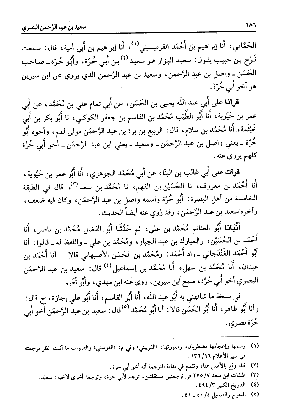الحمامي أنا إبراهيم بن أحمد القرميسيني (1) أنا إبراهيم بن أبي أمية قال سمعت نوح بن حبيب يقول سعيد البزار هو سعيد (2) بن أبي حرة وأبو حرة صاحب الحسن واصل بن عبد الرحمن وسعيد بن عبد الرحمن الذي يروي عن ابن سيرين هو أخو أبي حرة قرأنا على أبي عبد الله يحيى بن الحسن عن أبي تمام علي بن محمد عن أبي عمر بن حيوية أنا أبو الطيب محمد بن القاسم بن جعفر الكوكبي نا أبو بكر بن أبي خيثمة أنا محمد بن سلام قال الربيع بن برة بن عبد الرحمن مولى لهم وأخوه أبو حرة يعني واصل بن عبد الرحمن وسعيد يعني ابن عبد الرحمن أخو أبي حرة كلهم يروى عنه قرأت على أبي غالب بن البنا عن أبي محمد الجوهري أنا أبو عمر بن حيوية أنا أحمد بن معروف نا الحسين بن الفهم نا محمد بن سعد (3) قال في الطبقة الخامسة من أهل البصرة أبو حرة واسمه واصل بن عبد الرحمن وكان فيه ضعف وأخوه سعيد بن عبد الرحمن وقد روي عنه أيضا الحديث أنبأنا أبو الغنائم محمد بن علي ثم حدثنا أبو الفضل محمد بن ناصر أنا أحمد بن الحسين والمبارك بن عبد الجبار ومحمد بن علي واللفظ له قالوا أنا أبو أحمد الغندجاني زاد أحمد ومحمد بن الحسن الأصبهاني قالا أنا أحمد بن عبدان أنا محمد بن سهل أنا محمد بن إسماعيل (4) قال سعيد بن عبد الرحمن البصري أخو أبي حرة سمع ابن سيرين روى عنه ابن مهدي وأبو نعيم في نسخة ما شافهني به أبو عبد الله أنا أبو القاسم أنا أبو علي إجازة قال وأنا أبو طاهر أنا أبو الحسن قالا أنا أبو محمد (5) قال سعيد بن عبد الرحمن أخو أبي حرة بصري