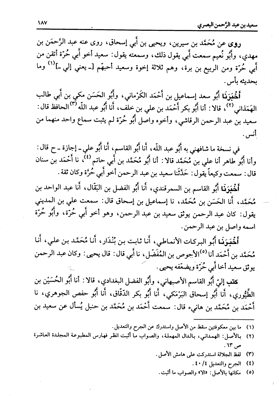 روى عن محمد بن سيرين ويحيى بن أبي إسحاق روى عنه عبد الرحمن بن مهدي وأبو نعيم سمعت أبي يقول ذلك وسمعته يقول سعيد أخو أبي حرة أتقن من أبي حرة ومن الربيع بن برة وهم ثلاثة إخوة وسعيد أحبهم يعني إلي (1) وما بحديثه بأس أخبرنا أبو سعد إسماعيل بن أحمد الكرماني وأبو الحسن مكي بن أبي طالب الهمذاني (1) قالا أنا أبو بكر أحمد بن علي بن خلف أنا أبو عبد الله (3) الحافظ قال سعيد بن عبد الرحمن الرقاشي وأخوه واصل أبو حرة لم يثبت سماع واحد منهما من أنس في نسخة ما شافهني به أبو عبد الله أنا أبو القاسم أنا أبو علي إجازة قال وأنا أبو طاهر أنا علي بن محمد قالا أنا أبو محمد بن أبي حاتم (4) نا أحمد بن سنان قال سمعت وكيعا يقول حدثنا سعيد بن عبد الرحمن أخو أبي حرة وكان ثقة أخبرنا أبو القاسم بن السمرقندي أنا أبو الفضل بن البقال أنا عبد الواحد بن محمد أنا الحسن بن محمد نا إسماعيل بن إسحاق قال سمعت علي بن المديني يقول كان عبد الرحمن يوثق سعيد بن عبد الرحمن وهو أخو أبي حرة وأبو حرة اسمه واصل بن عبد الرحمن أخبرنا أبو البركات الأنماطي أنا ثابت بن بندار أنا محمد بن علي أنا محمد بن أحمد أنا (5) الأحوص بن المفضل نا أبي قال قال يحيى وكان عبد الرحمن يوثق سعيد أخا أبي حرة ويضعفه يحيى كتب إلي أبو القاسم الأصبهاني وأبو الفضل البغدادي قالا أنا أبو الحسين بن الطيوري أنا أبو إسحاق البرمكي أنا أبو بكر الدقاق أنا أبو حفص الجوهري نا أحمد بن محمد بن هانئ قال سمعت أحمد بن محمد بن حنبل يسأل عن سعيد بن
