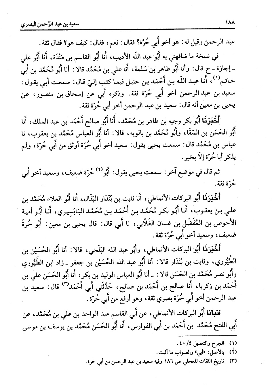 عبد الرحمن وقيل له هو أخو أبي حرة فقال نعم فقال كيف هو فقال ثقة في نسخة ما شافهني به أبو عبد الله الأديب أنا أبو القاسم بن مندة أنا أبو علي إجازة قال وأنا أبو طاهر بن سلمة أنا علي بن محمد قالا أنا أبو محمد بن أبي حاتم (1) أنا عبد الله بن أحمد بن حنبل فيما كتب إلي قال سمعت أبي يقول سعيد بن عبد الرحمن أخو أبي حرة ثقة وذكره أبي عن إسحاق بن منصور عن يحيى بن معين أنه قال سعيد بن عبد الرحمن أخو أبي حرة ثقة أخبرنا أبو بكر وجيه بن طاهر بن محمد أنا أبو صالح أحمد بن عبد الملك أنا أبو الحسن بن السقا وأبو محمد بن بالويه قالا أنا أبو العباس محمد بن يعقوب نا عباس بن محمد قال سمعت يحيى يقول سعيد أخو أبي حرة أوثق من أبي حرة ولم يذكر أبا حرة إلا بالخير ثم قال في موضع آخر سمعت يحيى يقول أبو (2) حرة ضعيف وسعيد أخو أبي حرة ثقة أخبرنا أبو البركات الأنماطي أنا ثابت بن بندار البقال أنا أبو العلاء محمد بن علي بن يعقوب أنا أبو بكر محمد بن أحمد بن محمد البابسيري أنا أبو أمية الأحوص بن المفضل بن غسان الغلابي نا أبي قال قال يحيى بن معين أبو حرة ضعيف وسعيد أخو أبي حرة ثقة أخبرنا أبو البركات الأنماطي وأبو عبد الله البلخي قالا أنا أبو الحسين بن الطيوري وثابت بن بندار قالا أنا أبو عبد الله الحسين بن جعفر زاد ابن الطيوري وأبو نصر محمد بن الحسن قالا أنا أبو العباس الوليد بن بكر أنا أبو الحسن علي بن أحمد بن زكريا أنا صالح بن أحمد بن صالح حدثني أبي أحمد (3) قال سعيد بن عبد الرحمن أخو أبي حرة بصري ثقة وهو أرفع من أبي حرة أنبأنا أبو البركات الأنماطي عن أبي القاسم عبد الواحد بن علي بن محمد عن أبي الفتح محمد بن أحمد بن أبي الفوارس أنا أبو الحسن محمد بن يوسف بن موسى