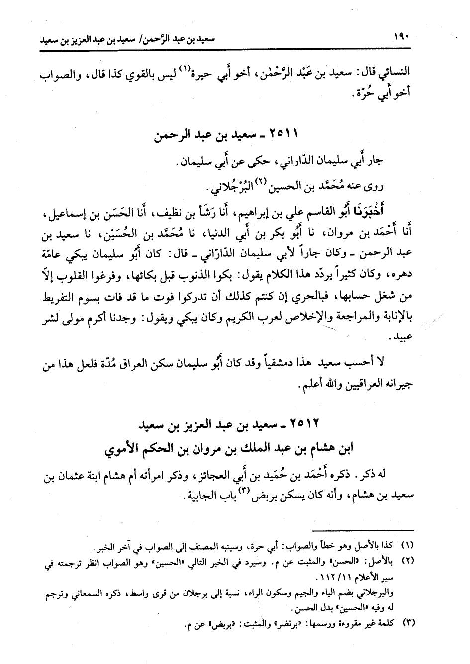 النسائي قال سعيد بن عبد الرحمن أخو أبي حيرة (1) ليس بالقوي كذا قال والصواب أخو أبي حرة 2511 سعيد بن عبد الرحمن جار أبي سليمان الداراني حكى عن أبي سليمان روى عنه محمد بن الحسين (2) البرجلاني أخبرنا أبو القاسم علي بن إبراهيم أنا رشأ بن نظيف أنا الحسن بن إسماعيل أنا أحمد بن مروان نا أبو بكر بن أبي الدنيا نا محمد بن الحسين نا سعيد بن عبد الرحمن وكان جارا لأبي سليمان الداراني قال كان أبو سليمان يبكي عامة دهره وكان كثيرا يردد هذا الكلام يقول بكوا الذنوب قبل بكائها وفرغوا القلوب إلا من شغل حسابها فالبحري إن كنتم كذلك أن تدركوا فوت ما قد فات بسوم التفريط بالإنابة والمراجعة والإخلاص لعرب الكريم وكان يبكي ويقول وجدنا أكرم مولى لشر عبيد لا أحسب سعيد هذا دمشقيا وقد كان أبو سليمان سكن العراق مدة فلعل هذا من جيرانه العراقيين والله أعلم