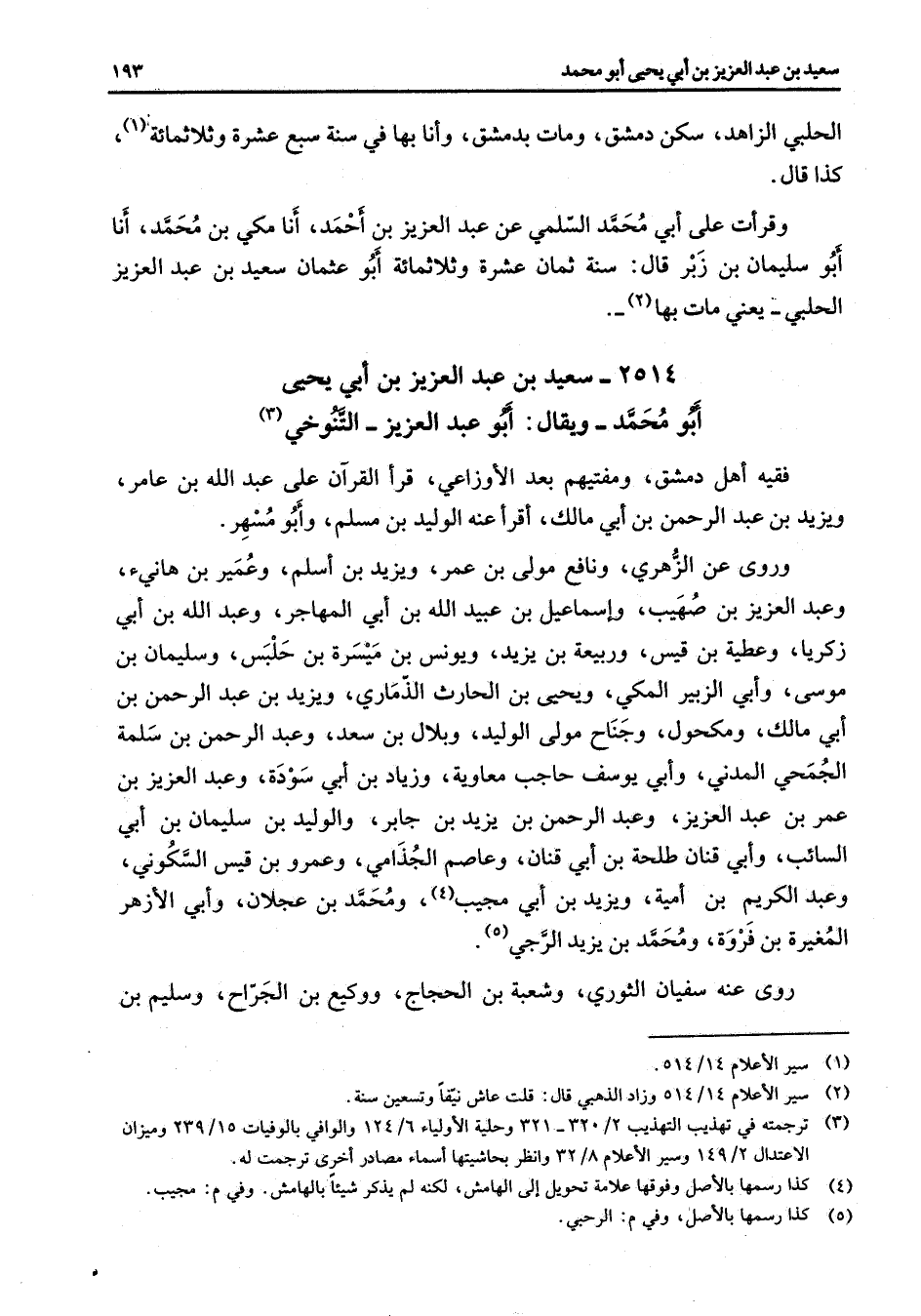 2514 - سعيد بن عبد العزيز بن أبي يحيى أبو محمد ويقال أبو عبد العزيز التنوخي (3) فقيه أهل دمشق ومفتيهم بعد الأوزاعي قرأ القرآن على عبد الله بن عامر يزيد بن عبد الرحمن بن أبي مالك أقرأ عنه الوليد بن مسلم وأبو مسهر وروى عن الزهري ونافع مولى بن عمر ويزيد بن أسلم وعمير بن هانئ وعبد العزيز بن صهيب وإسماعيل بن عبيد الله بن أبي المهاجر وعبد الله بن أبي زكريا وعطية بن قيس وربيعة بن يزيد ويونس بن ميسرة بن حلبس وسليمان بن موسى وأبي الزبير المكي ويحيى بن الحارث الذماري ويزيد بن عبد الرحمن بن أبي مالك ومكحول وجناح مولى الوليد وبلال بن سعد وعبد الرحمن بن سلمة الجمحي المدني وأبي يوسف حاجب معاوية وزيادة بن أبي سودة وعبد العزيز بن عمر بن عبد العزيز وعبد الرحمن بن يزيد بن جابر والوليد بن سليمان بن أبي السائب وأبي قنان طلحة بن أبي قنان وعاصم الجذامي وعمرو بن قيس السكوني وعبد الكريم بن أمية ويزيد بن أبي مجيب (4) ومحمد بن عجلان وأبي الأزهر المغيرة بن فروة ومحمد بن يزيد الرجي (5) روى عنه سفيان الثوري وشعبة بن الحجاج ووكيع بن الجراح وسليم بن
