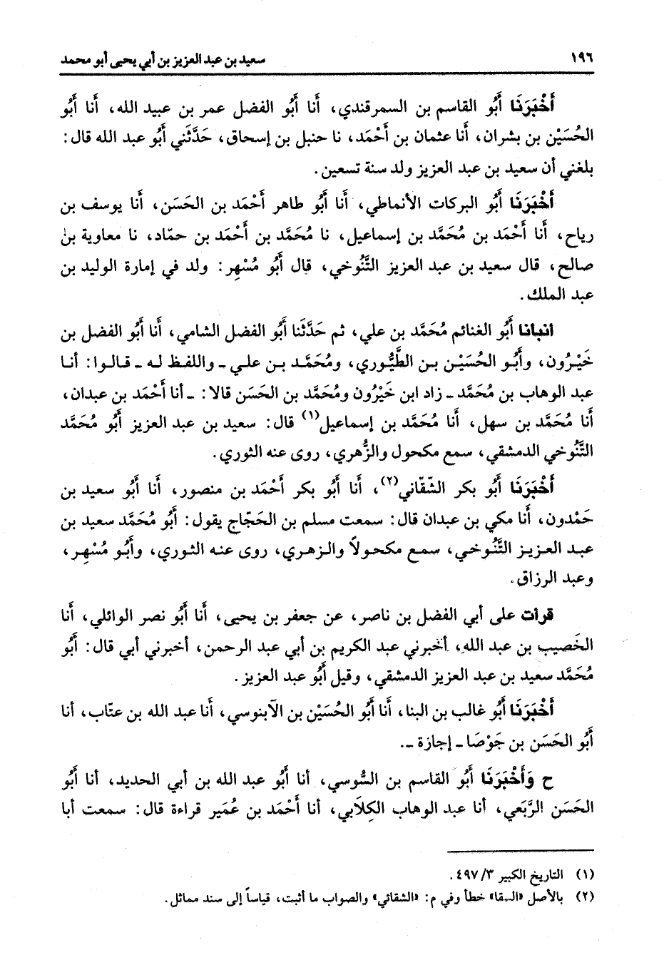 أخبرنا أبو القاسم بن السمرقندي أنا أبو الفضل عمر بن عبيد الله أنا أبو الحسين بن بشران أنا عثمان بن أحمد نا حنبل بن إسحاق حدثني أبو عبد الله قال بلغني أن سعيد بن عبد العزيز ولد سنة تسعين أخبرنا أبو البركات الأنماطي أنا أبو طاهر أحمد بن الحسن أنا يوسف بن رياح أنا أحمد بن محمد بن إسماعيل نا محمد بن أحمد بن حماد نا معاوية بن صالح قال سعيد بن عبد العزيز التنوخي قال أبو مسهر ولد في إمارة الوليد بن عبد الملك أنبأنا أبو الغنائم محمد بن علي ثم حدثنا أبو الفضل الشامي أنا أبو الفضل بن خيرون وأبو الحسين بن الطيوري ومحمد بن علي واللفظ له قالوا أنا عبد الوهاب بن محمد زاد ابن خيرون ومحمد بن الحسن قالا أنا أحمد بن عبدان أنا محمد بن سهل أنا محمد بن إسماعيل (1) قال سعيد عبد العزيز أبو محمد التنوخي الدمشقي سمع مكحول والزهري روى عنه الثوري أخبرنا أبو بكر الشقاني (2) أنا أبو بكر أحمد بن منصور أنا أبو سعيد بن حمدون أنا مكي بن عبدان قال سمعت مسلم بن الحجاج يقول أبو محمد سعيد بن عبد العزيز التنوخي سمع مكحولا والزهري روى عنه الثوري وأبو مسهر وعبد الرزاق قرأت على أبي الفضل بن ناصر عن جعفر بن يحيى أنا أبو نصر الوائلي أنا الخصيب بن عبد الله أخبرني عبد الكريم بن أبي عبد الرحمن أخبرني أبي قال أبو محمد سعيد بن عبد العزيز الدمشقي وقيل أبو عبد العزيز أخبرنا أبو غالب بن البنا أنا أبو الحسين بن الآبنوسي أنا عبد الله بن عتاب أنا أبو الحسن بن جوصا إجازة ح وأخبرنا أبو القاسم بن السوسي أنا أبو عبد الله بن أبي الحديد أنا أبو الحسن الربعي أنا عبد الوهاب الكلابي أنا أحمد بن عمير قراءة قال سمعت أبا