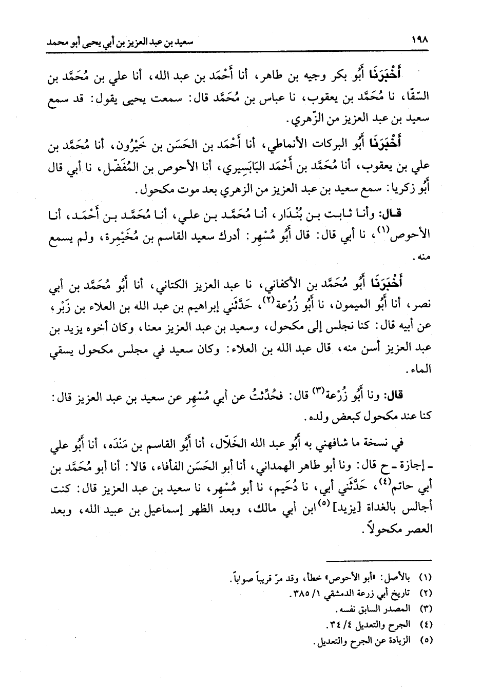 أخبرنا أبو بكر وجيه بن طاهر أنا أحمد بن عبد الله أنا علي بن محمد بن السقا نا محمد بن يعقوب نا عباس بن محمد قال سمعت يحيى يقول قد سمع سعيد بن عبد العزيز من الزهري أخبرنا أبو البركات الأنماطي أنا أحمد بن الحسن بن خيرون أنا محمد بن علي بن يعقوب أنا محمد بن أحمد البابسيري أنا الأحوص بن المفضل نا أبي قال أبو زكريا سمع سعيد بن عبد العزيز من الزهري بعد موت مكحول قال وأنا ثابت بن بندار أنا محمد بن علي أنا محمد بن أحمد أنا الأحوص (1) نا أبي قال قال أبو مسهر أدرك سعيد القاسم بن مخيمرة ولم يسمع منه أخبرنا أبو محمد بن الأكفاني نا عبد العزيز الكتاني أنا أبو محمد بن أبي نصر أنا أبو الميمون نا أبو زرعة (2) حدثني إبراهيم بن عبد الله بن العلاء بن زبر عن أبيه قال كنا نجلس إلى مكحول وسعيد بن عبد العزيز معنا وكان أخوه يزيد بن عبد العزيز أسن منه قال عبد الله بن العلاء وكان سعيد في مجلس مكحول يسقي الماء قال ونا أبو زرعة (3) قال فحدثت عن أبي مسهر عن سعيد بن عبد العزير قال كنا عند مكحول كبعض ولده في نسخة ما شافهني به أبو عبد الله الخلال أنا أبو القاسم بن مندة أنا أبو علي إجازة قال ونا أبو طاهر الهمداني أنا أبو الحسن الفأفاء قالا أنا أبو محمد بن أبي حاتم (4) حدثني أبي نا دحيم نا أبو مسهر نا سعيد بن عبد العزيز قال كنت أجالس بالغداة يزيد (5) ابن أبي مالك وبعد الظهر إسماعيل بن عبيد الله وبعد العصر مكحولا