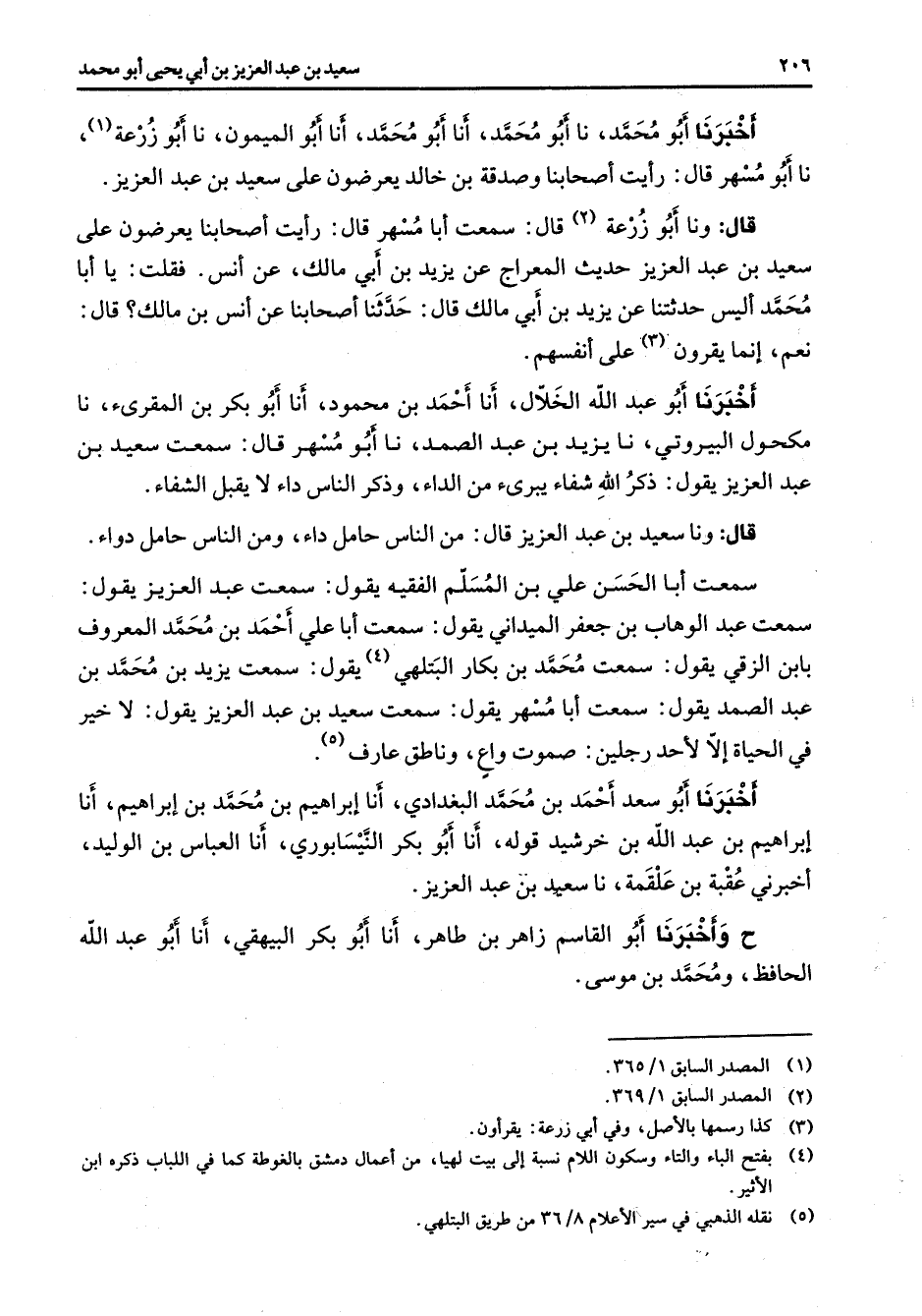 أخبرنا أبو محمد نا أبو محمد أنا أبو محمد أنا أبو الميمون نا أبو زرعة (1) نا أبو مسهر قال رأيت أصحابنا وصدقة بن خالد يعرضون على سعيد بن عبد العزيز قال ونا أبو زرعة (2) قال سمعت أبا مسهر قال رأيت أصحابنا يعرضون على سعيد بن عبد العزيز حديث المعراج عن يزيد بن أبي مالك عن أنس فقلت يا أبا محمد أليس حدثتنا عن يزيد بن أبي مالك قال حدثنا أصحابنا عن أنس بن مالك قال نعم إنما يقرون (3) على أنفسهم أخبرنا أبو عبد الله الخلال أنا أحمد بن محمود أنا أبو بكر بن المقرئ نا مكحول البيروتي نا يزيد بن عبد الصمد نا أبو مسهر قال سمعت سعيد بن عبد العزيز يقول ذكر الله شفاء يبرئ من الداء وذكر الناس داء لا يقبل الشفاء قال ونا سعيد بن عبد العزيز قال من الناس حامل داء ومن الناس حامل دواء سمعت أبا الحسن علي بن المسلم الفقيه يقول سمعت عبد العزيز يقول سمعت عبد الوهاب بن جعفر الميداني يقول سمعت أبا علي أحمد بن محمد المعروف بابن الزقي يقول سمعت محمد بن بكار البتلهي (4) يقول سمعت يزيد بن محمد بن عبد الصمد يقول سمعت أبا مسهر يقول سمعت سعيد بن عبد العزيز يقول لا خير في الحياة إلا لأحد رجلين صموت واع وناطق عارف (5) أخبرنا أبو سعد أحمد بن محمد البغدادي أنا إبراهيم بن محمد بن إبراهيم أنا إبراهيم بن عبد الله بن خرشيد قوله أنا أبو بكر النيسابوري أنا العباس بن الوليد أخبرني عقبة بن علقمة نا سعيد بن عبد العزيز ح وأخبرنا أبو القاسم زاهر بن طاهر أنا أبو بكر البيهقي أنا أبو عبد الله الحافظ ومحمد بن موسى