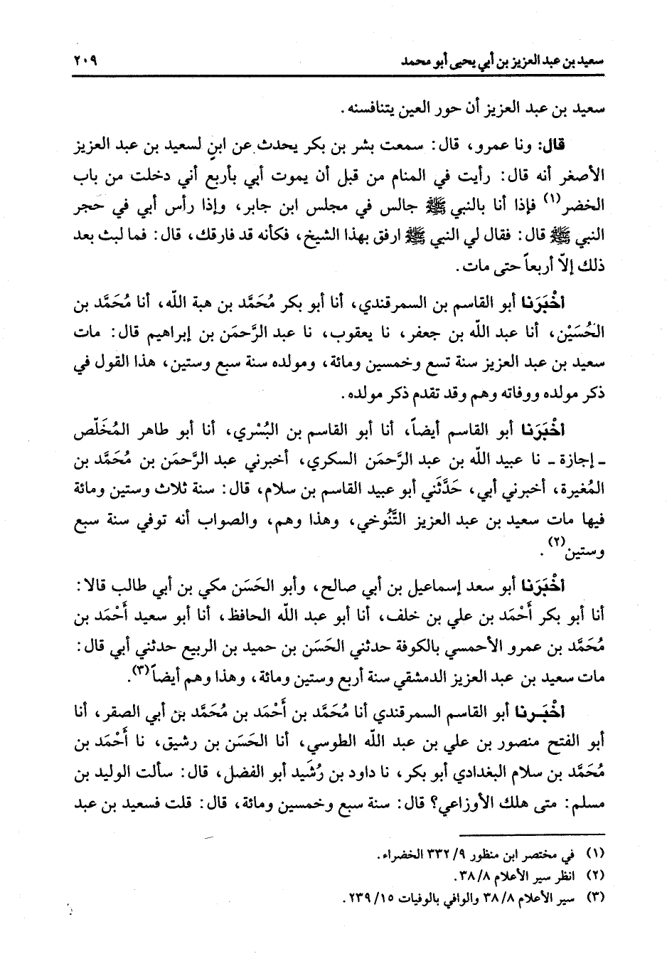 سعيد بن عبد العزيز أن حور العين يتنافسنه قال ونا عمرو قال سمعت بشر بن بكر يحدث عن ابن لسعيد بن عبد العزيز الأصغر أنه قال رأيت في المنام من قبل أن يموت أبي بأربع أني دخلت من باب الخضر (1) فإذا أنا بالنبي (صلى الله عليه وسلم) جالس في مجلس ابن جابر وإذا رأس أبي في حجر لنبي (صلى الله عليه وسلم) قال فقال لي النبي (صلى الله عليه وسلم) ارفق بهذا الشيخ فكأنه قد فارقك قال فما لبث بعد ذلك إلا أربعا حتى مات أخبرنا أبو القاسم بن السمرقندي أنا أبو بكر محمد بن هبة الله أنا محمد بن الحسين أنا عبد الله بن جعفر نا يعقوب نا عبد الرحمن بن إبراهيم قال مات سعيد بن عبد العزيز سنة تسع وخمسين ومائة ومولده سنة سبع وستين هذا القول في ذكر مولده ووفاته وهم وقد تقدم ذكر مولده أخبرنا أبو القاسم أيضا أنا أبو القاسم بن البسري أنا أبو طاهر المخلص إجازة نا عبيد الله بن عبد الرحمن السكري أخبرني عبد الرحمن بن محمد بن المغيرة أخبرني أبي حدثني أبو عبيد القاسم بن سلام قال سنة ثلاث وستين ومائة فيها مات سعيد بن عبد العزيز التنوخي وهذا وهم والصواب أنه توفي سنة سبع وستين (2) أخبرنا أبو سعد إسماعيل بن أبي صالح وأبو الحسن مكي بن أبي طالب قالا أنا أبو بكر أحمد بن علي بن خلف أنا أبو عبد الله الحافظ أنا أبو سعيد أحمد بن محمد بن عمرو الأحمسي بالكوفة حدثني الحسن بن حميد بن الربيع حدثني أبي قال مات سعيد بن عبد العزيز الدمشقي سنة أربع وستين ومائة وهذا وهم أيضا (3) أخبرنا أبو القاسم السمرقندي أنا محمد بن أحمد بن محمد بن أبي الصقر أنا أبو الفتح منصور بن علي بن عبد الله الطوسي أنا الحسن بن رشيق نا أحمد بن محمد بن سلام البغدادي أبو بكر نا داود بن رشيد أبو الفضل قال سألت الوليد بن مسلم متى هلك الأوزاعي قال سنة سبع وخمسين ومائة قال قلت فسعيد بن عبد