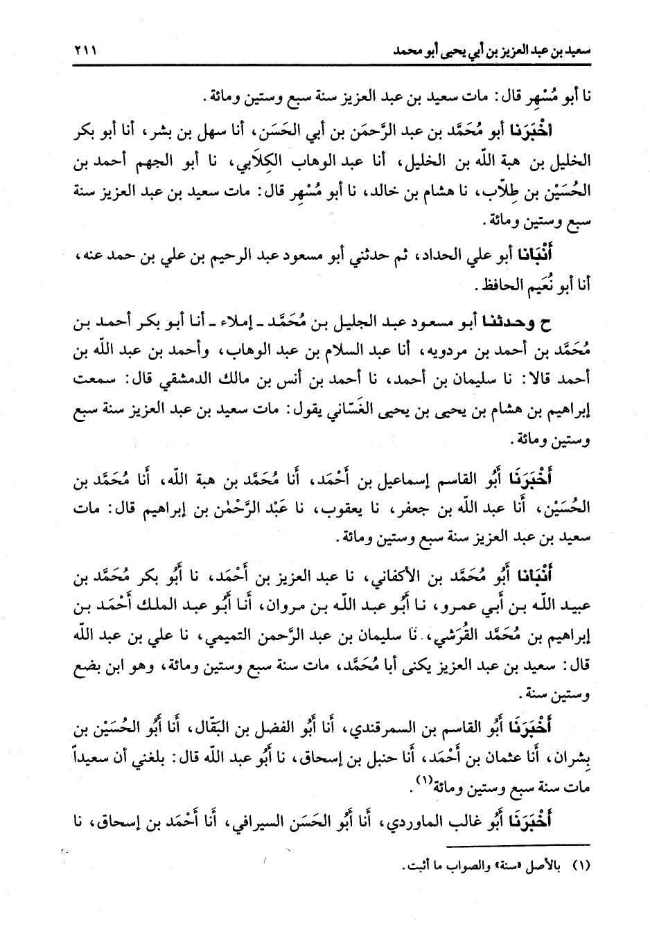 نا أبو مسهر قال مات سعيد بن عبد العزيز سنة سبع وستين ومائة أخبرنا أبو محمد بن عبد الرحمن بن أبي الحسن أنا سهل بن بشر أنا أبو بكر الخليل بن هبة الله بن الخليل أنا عبد الوهاب الكلابي نا أبو الجهم أحمد بن الحسين بن طلاب نا هشام بن خالد نا أبو مسهر قال مات سعيد بن عبد العزيز سنة سبع وستين ومائة أنبأنا أبو علي الحداد ثم حدثني أبو مسعود عبد الرحيم بن علي بن حمد عنه أنا أبو نعيم الحافظ ح وحدثنا أبو مسعود عبد الجليل بن محمد إملاء أنا أبو بكر أحمد بن محمد بن أحمد بن مردويه أنا عبد السلام بن عبد الوهاب وأحمد بن عبد الله بن أحمد قالا نا سليمان بن أحمد نا أحمد بن أنس بن مالك الدمشقي قال سمعت إبراهيم بن هشام بن يحيى بن يحيى الغساني يقول مات سعيد بن عبد العزيز سنة سبع وستين ومائة أخبرنا أبو القاسم إسماعيل بن أحمد أنا محمد بن هبة الله أنا محمد بن الحسين أنا عبد الله بن جعفر نا يعقوب نا عبد الرحمن بن إبراهيم قال مات سعيد بن عبد العزيز سنة سبع وستين ومائة أنبأنا أبو محمد بن الأكفاني نا عبد العزيز بن أحمد نا أبو بكر محمد بن عبيد الله بن أبي عمرو نا أبو عبد الله بن مروان أنا أبو عبد الملك أحمد بن إبراهيم بن محمد القرشي نا سليمان بن عبد الرحمن التميمي نا علي بن عبد الله قال سعيد بن عبد العزيز يكنى أبا محمد مات سنة سبع وستين ومائة وهو ابن بضع وستين سنة أخبرنا أبو القاسم بن السمرقندي أنا أبو الفضل بن البقال أنا أبو الحسين بن بشران أنا عثمان بن أحمد أنا حنبل بن إسحاق نا أبو عبد الله قال بلغني أن سعيدا مات سنة سبع وستين ومائة (1) أخبرنا أبو غالب الماوردي أنا أبو الحسن السيرافي أنا أحمد بن إسحاق نا